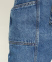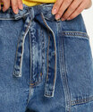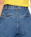 Calça feminina modelo mom clochard, confeccionada em tecido plano jeans. Possui tira de amarração, cós com passantes, fechamento por botão e zíper no entremeio, bolsos frontais e atrás, acabamento no tom e costura contrastante.