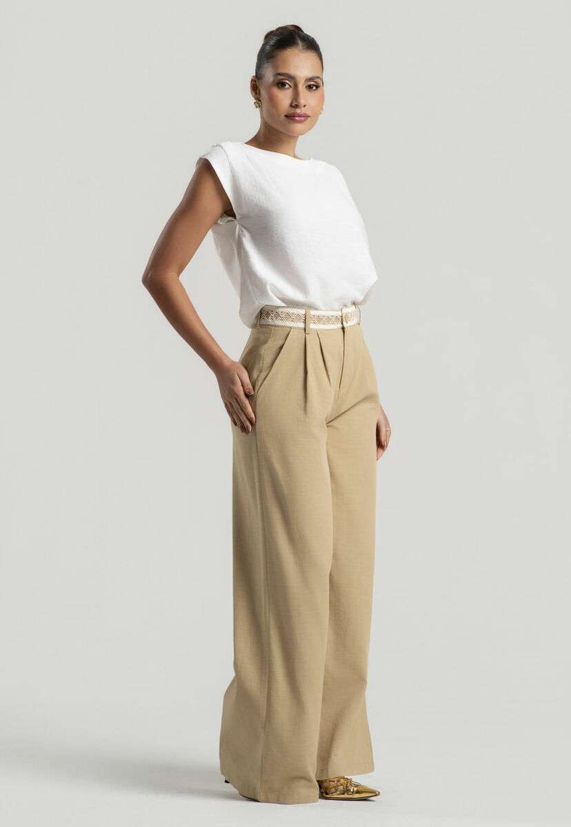 Calça Pantalona Alfaiataria Com Cinto de Renda Bege Salvatore