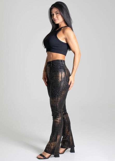 Calça sarja feminina de modelagem boot cut, com caimento mais solto ao corpo. Cintura alta Fechamento com botão e zíper Bolsos frontais falsos e bolsos traseiros funcionais Barra simples lateral Tecido: Sarja Tipo de lavagem: Foil animal print Cor: Preto