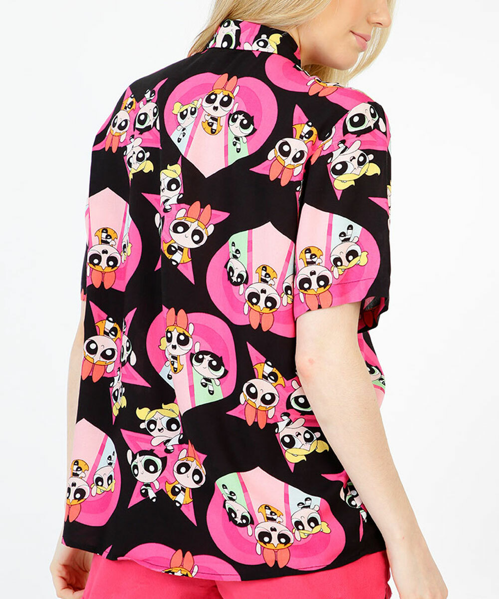 Camisa feminina confeccionada em tecido plano viscose. Possui estampa meninas super poderosas, gola dobrável, fechamento por botões no entremeio, manga curta, acabamento e costura no tom.