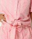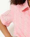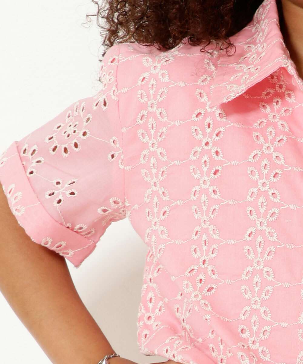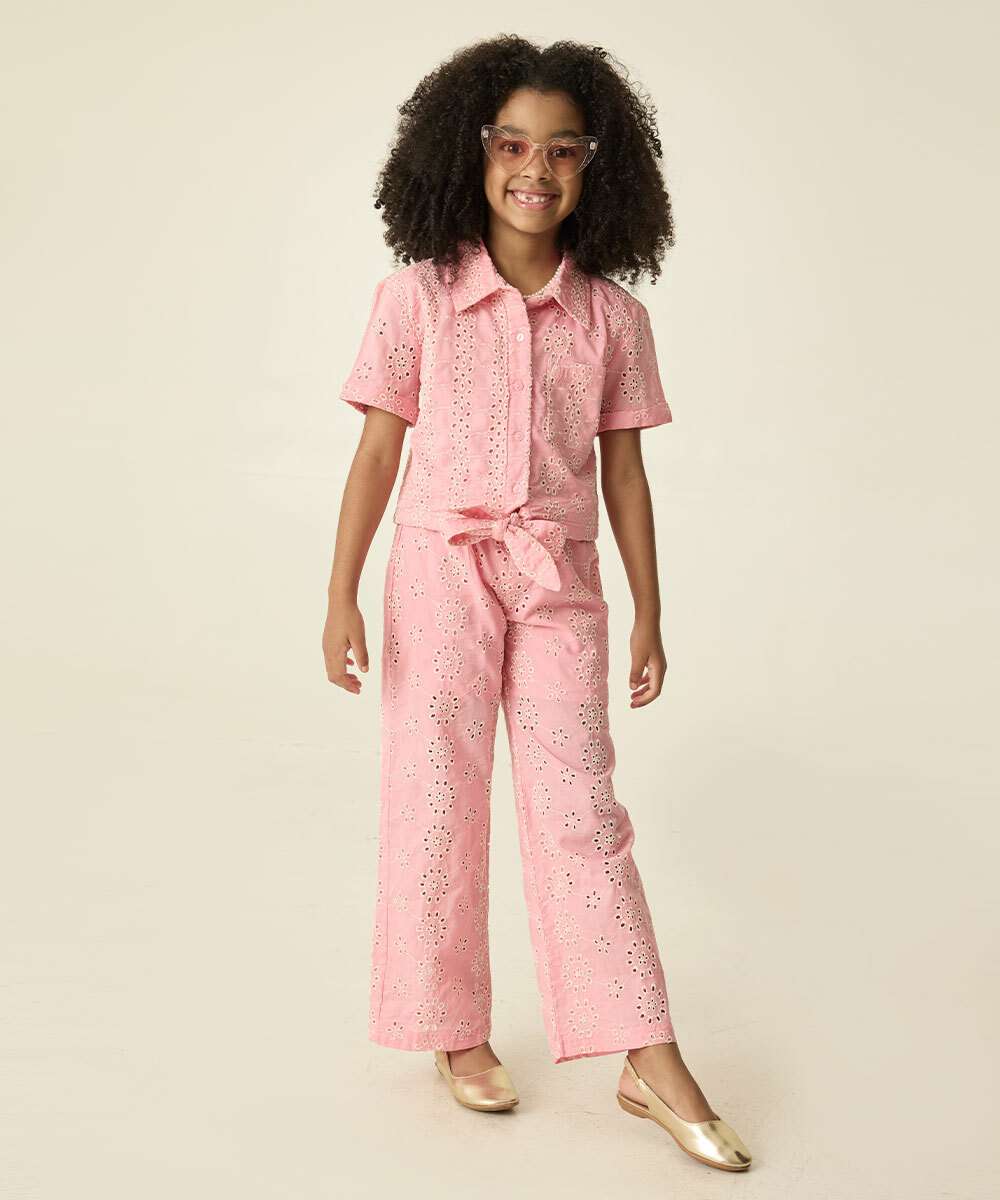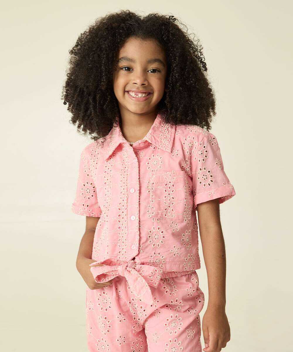 Camisa infantil, modelo cropped, ideal para meninas de 04 até 10 anos de idade, confeccionada em tecido laise. Possui gola dobrável, fechamento por botões no entremeio, bolso localizado, manga curta, acabamento e costura no tom.