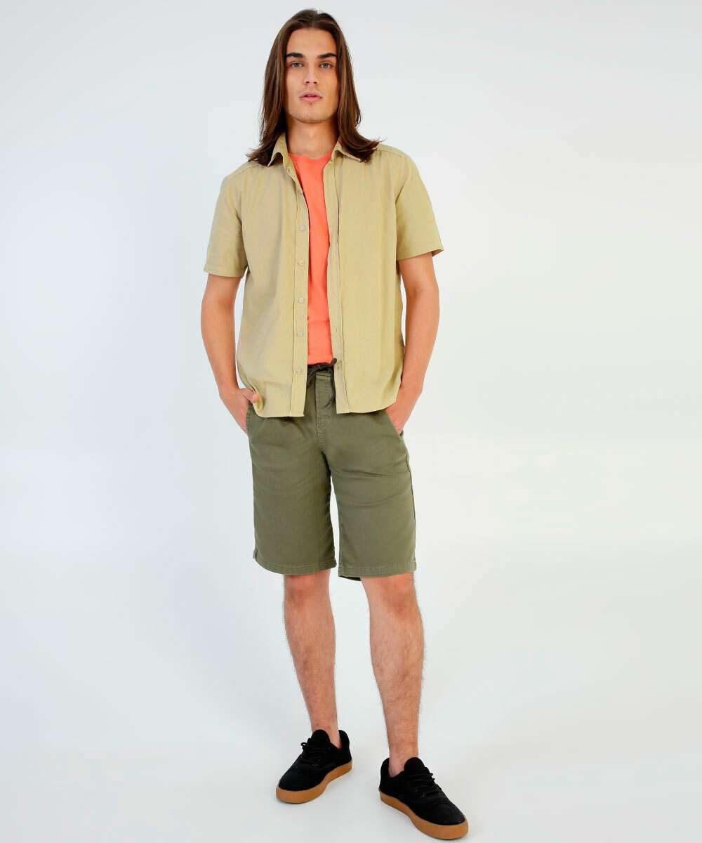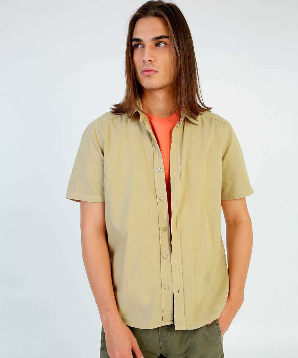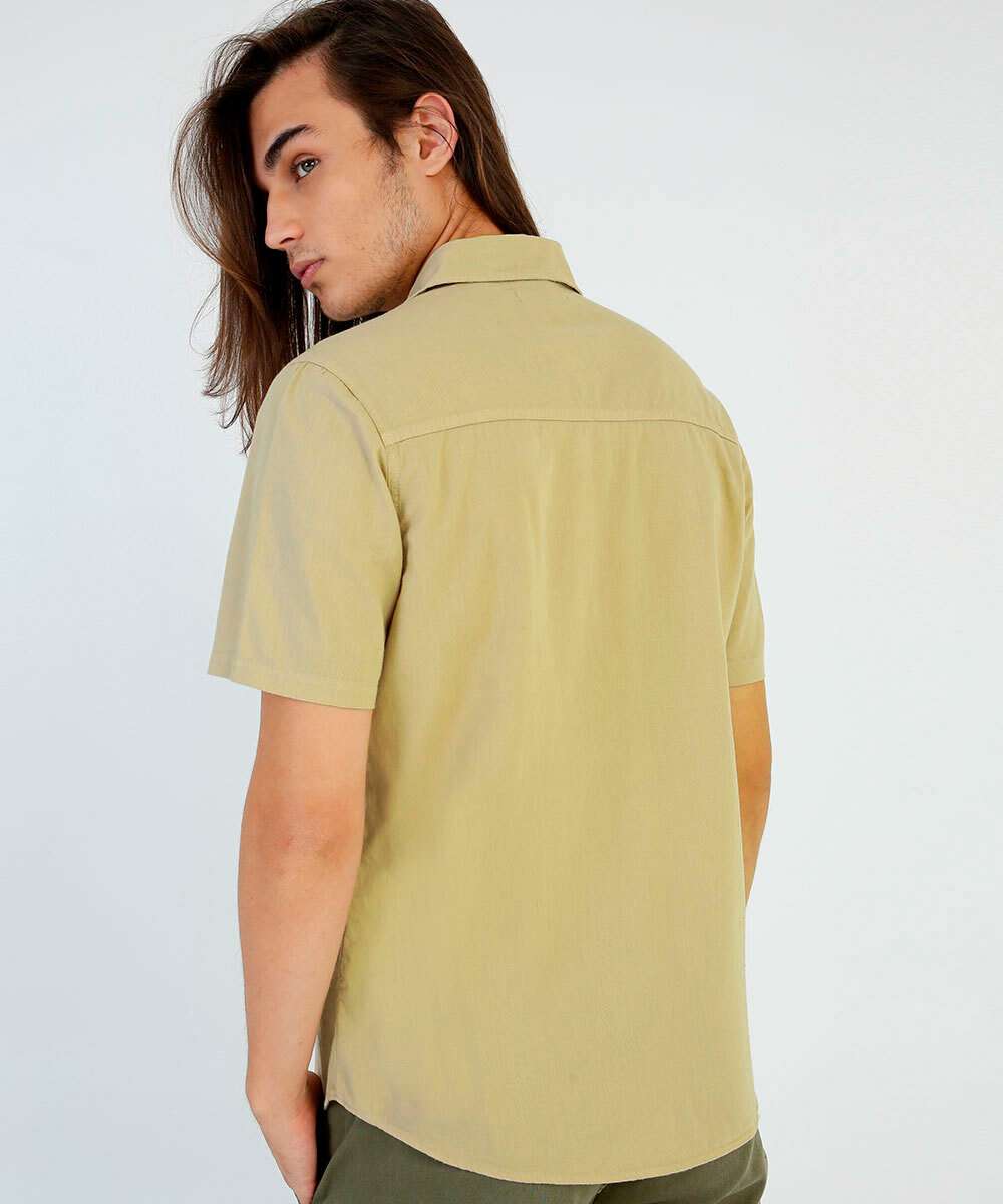 Camisa masculina confeccionada em tecido plano algodão. Possui gola dobrável, fechamento por botões no entremeio, manga curta, acabamento e costura no tom.