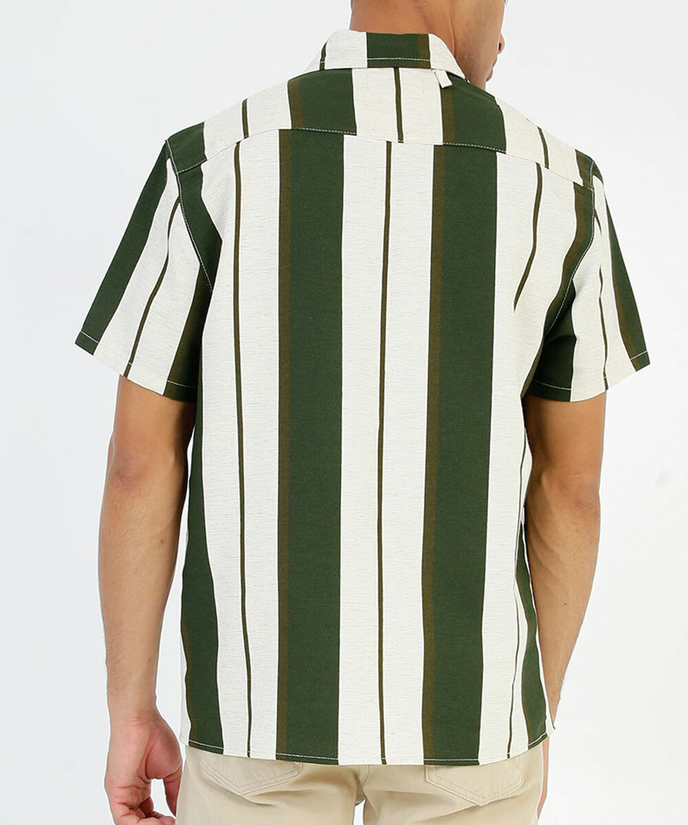 Camisa masculina confeccionada em tecido plano algodão, viscose, modal e linho. Possui gola dobrável, fechamento por botões, estampa listras, manga curta, acabamento e costura no tom.