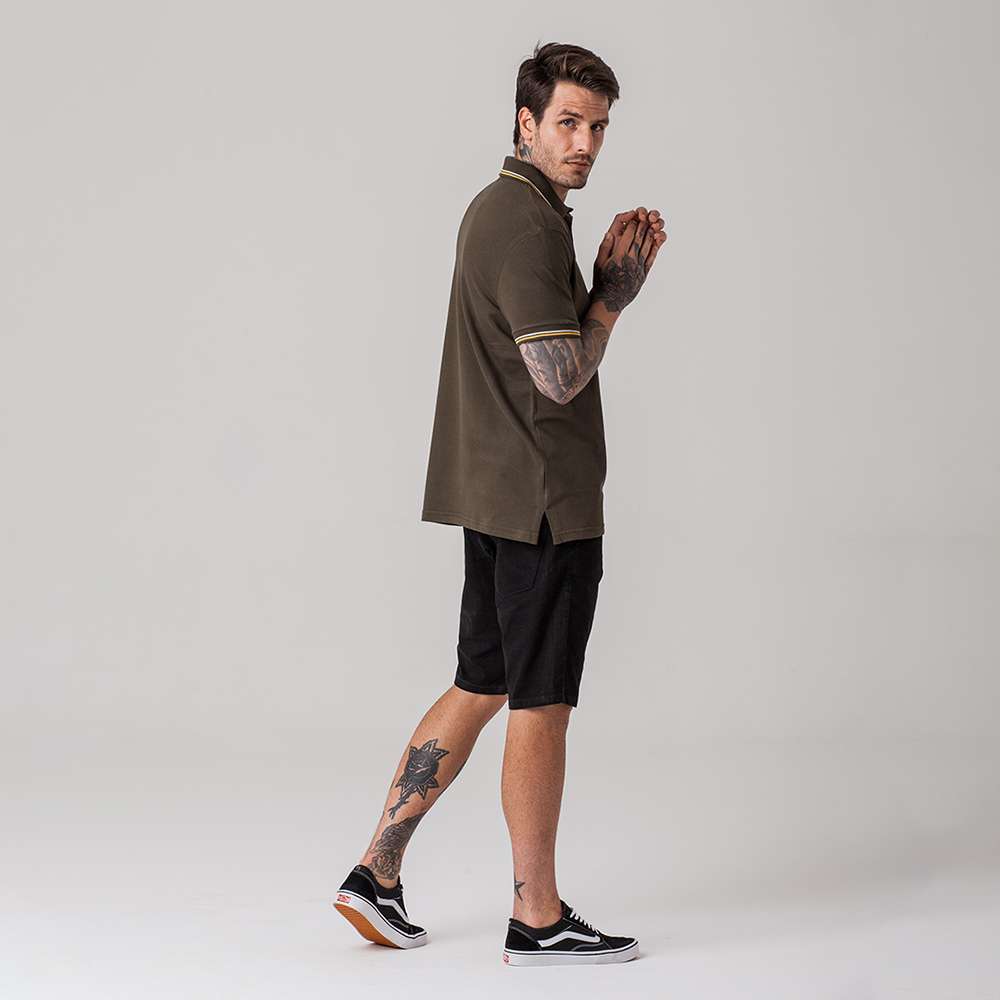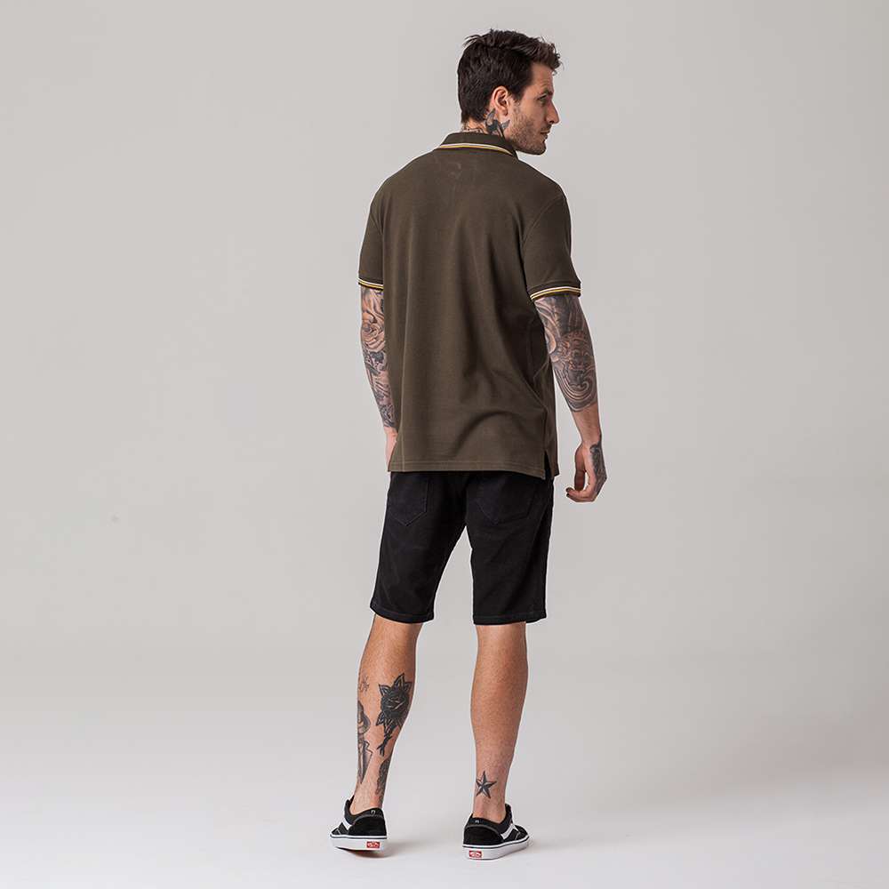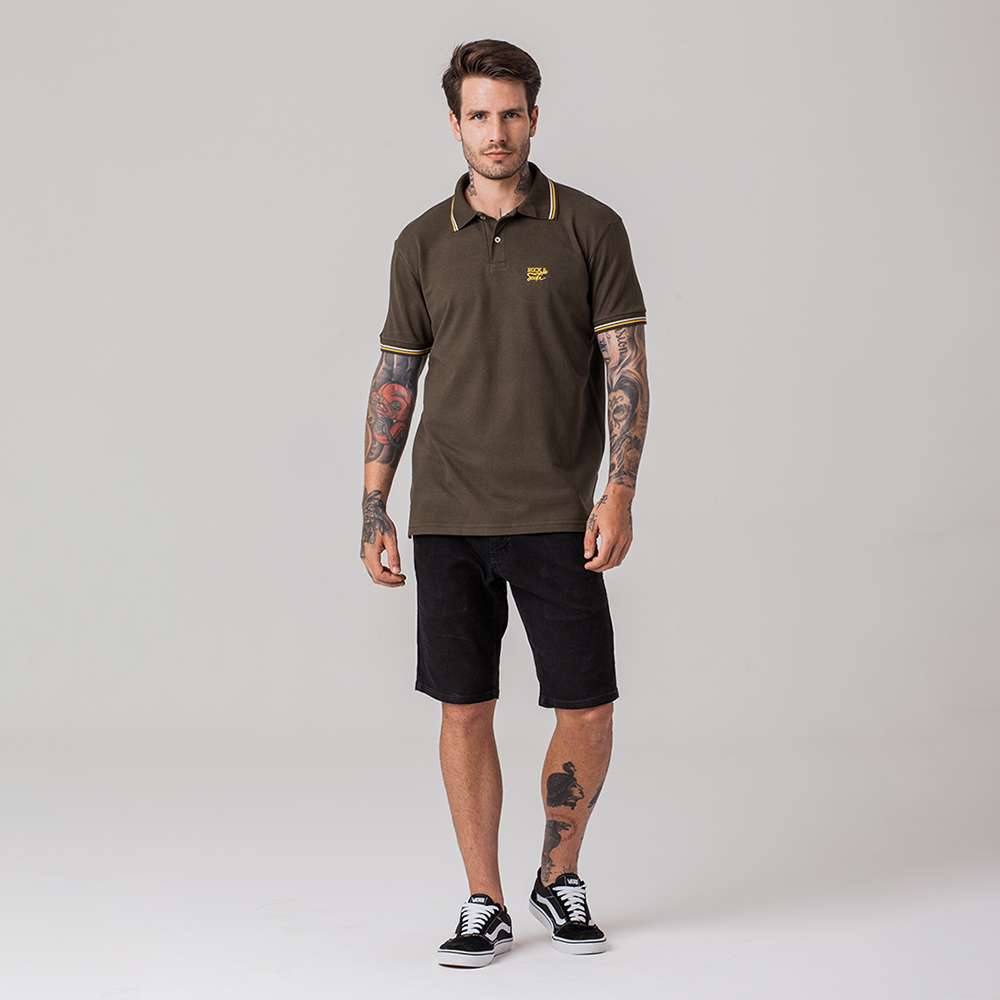 Camisa Polo masculina confeccionada em tecido confortável. Possui gola dobrável, fechamento por botões no entremeio, manga curta, detalhe nas mangas, gola e busto em cor contrastante, e acabamento e costura no mesmo tom.