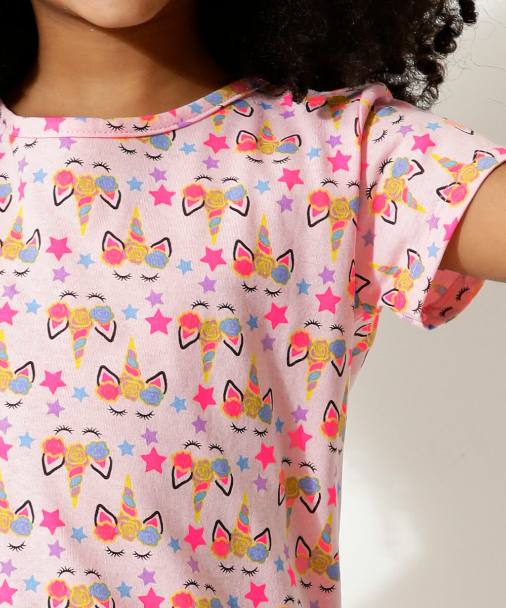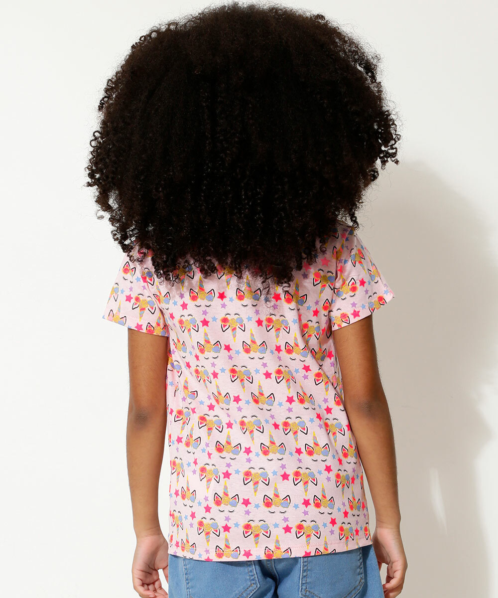 Camiseta infantil, ideal para meninas de 04 até 10 anos de idade, confeccionada em malha algodão. Possui estampa frontal unicórnio, decote redondo, manga curta, acabamento e costura no tom.
