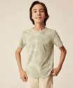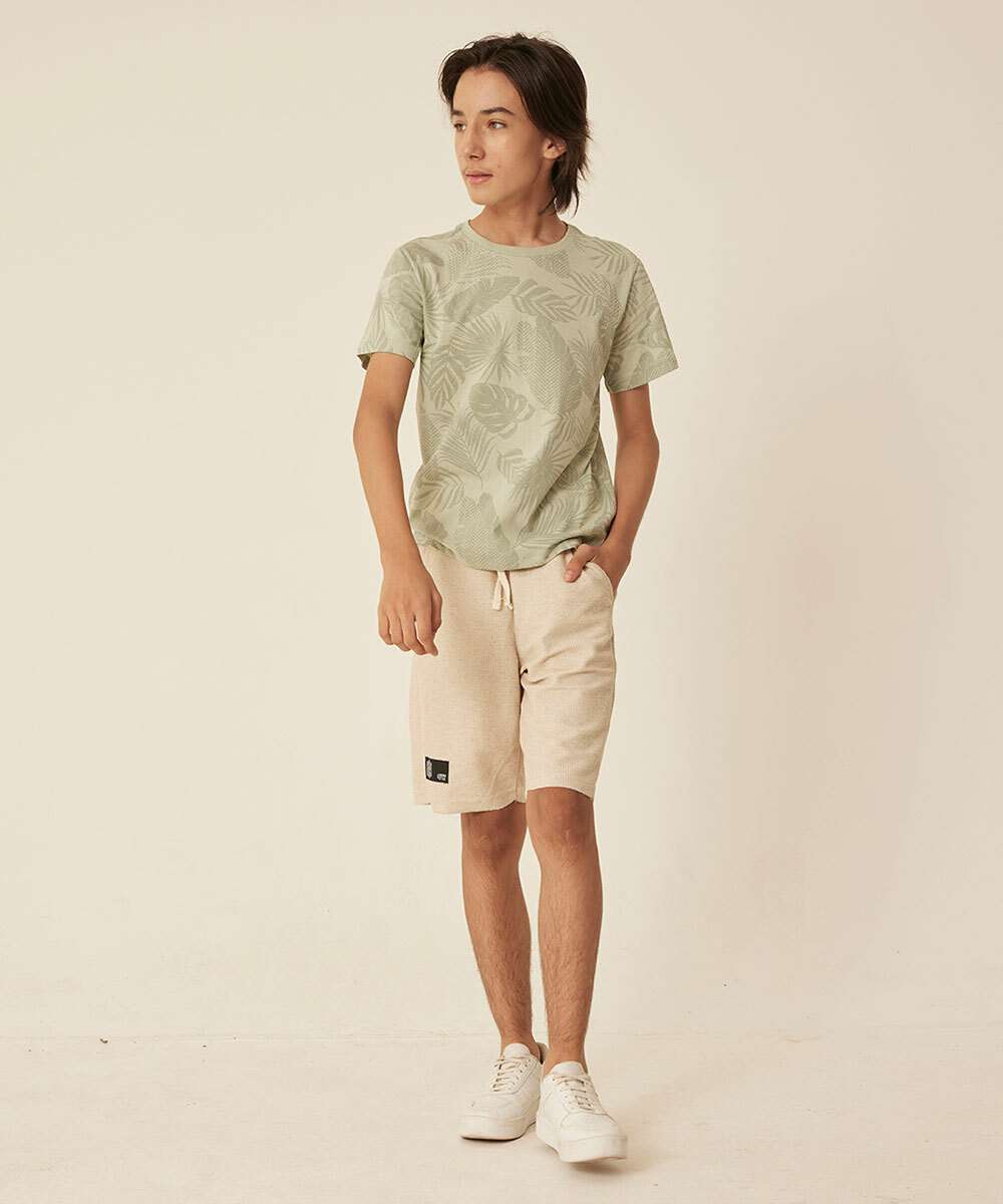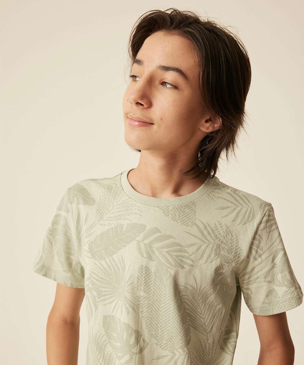Camiseta juvenil, ideal para meninos de 10 até 16 anos de idade, confeccionada em malha algodão. Possui estampa folhas, gola redonda, manga curta, acabamento e costura no tom.
