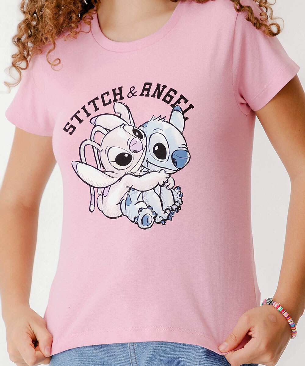 Camiseta Juvenil Manga Curta Stitch e Angel Disney Tam 10 a 16