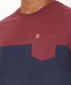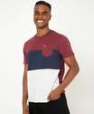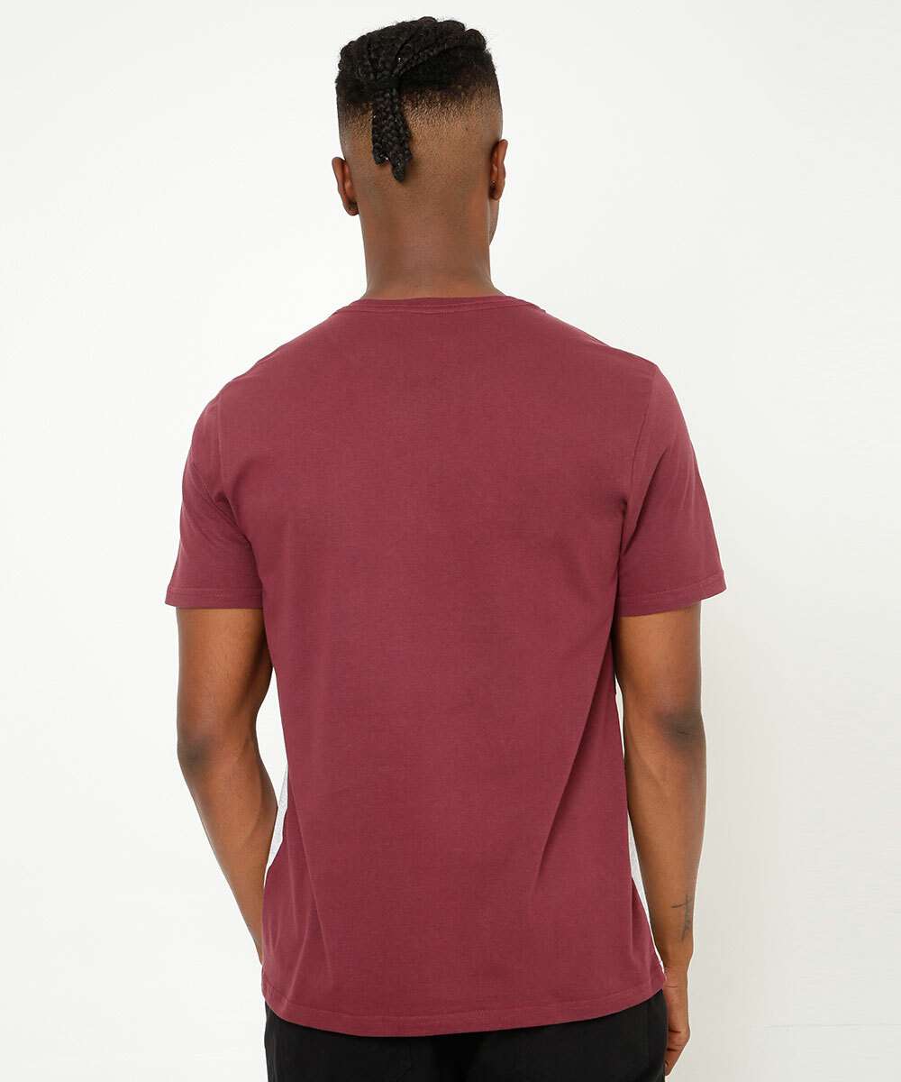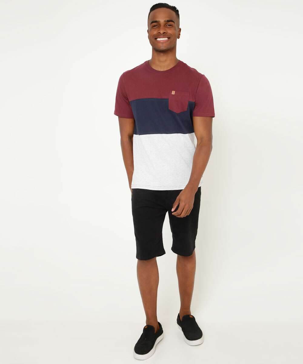Camiseta masculina, confeccionada em malha algodão. Possui recortes em cores contrastantes, bolso localizado, gola redonda, manga curta, acabamento e costura no tom.