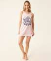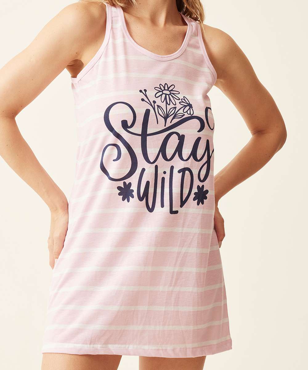 Camisola listrada com estampa frase frontal, sem manga, possui decote redondo.