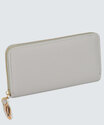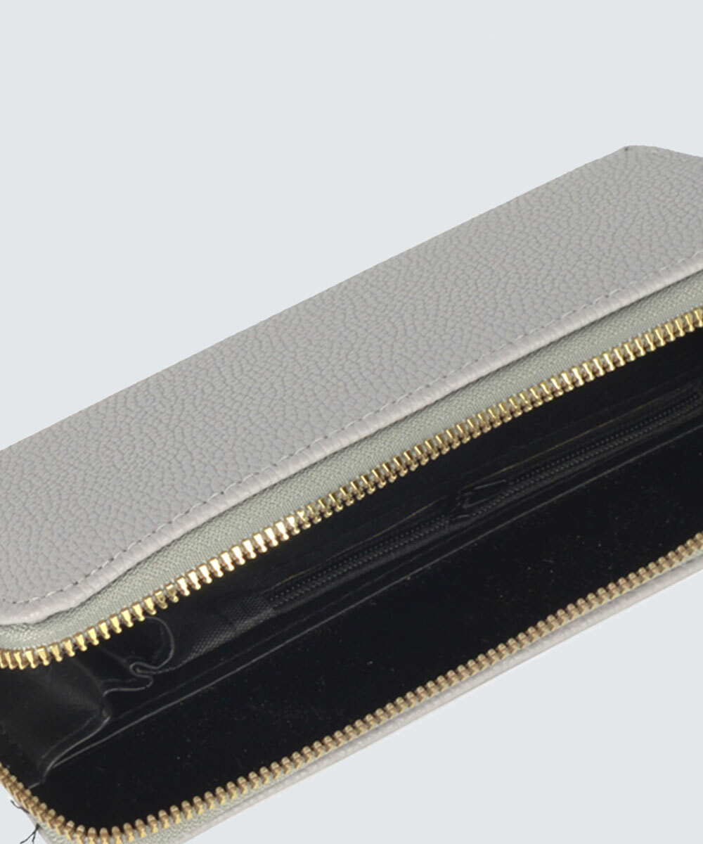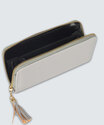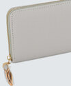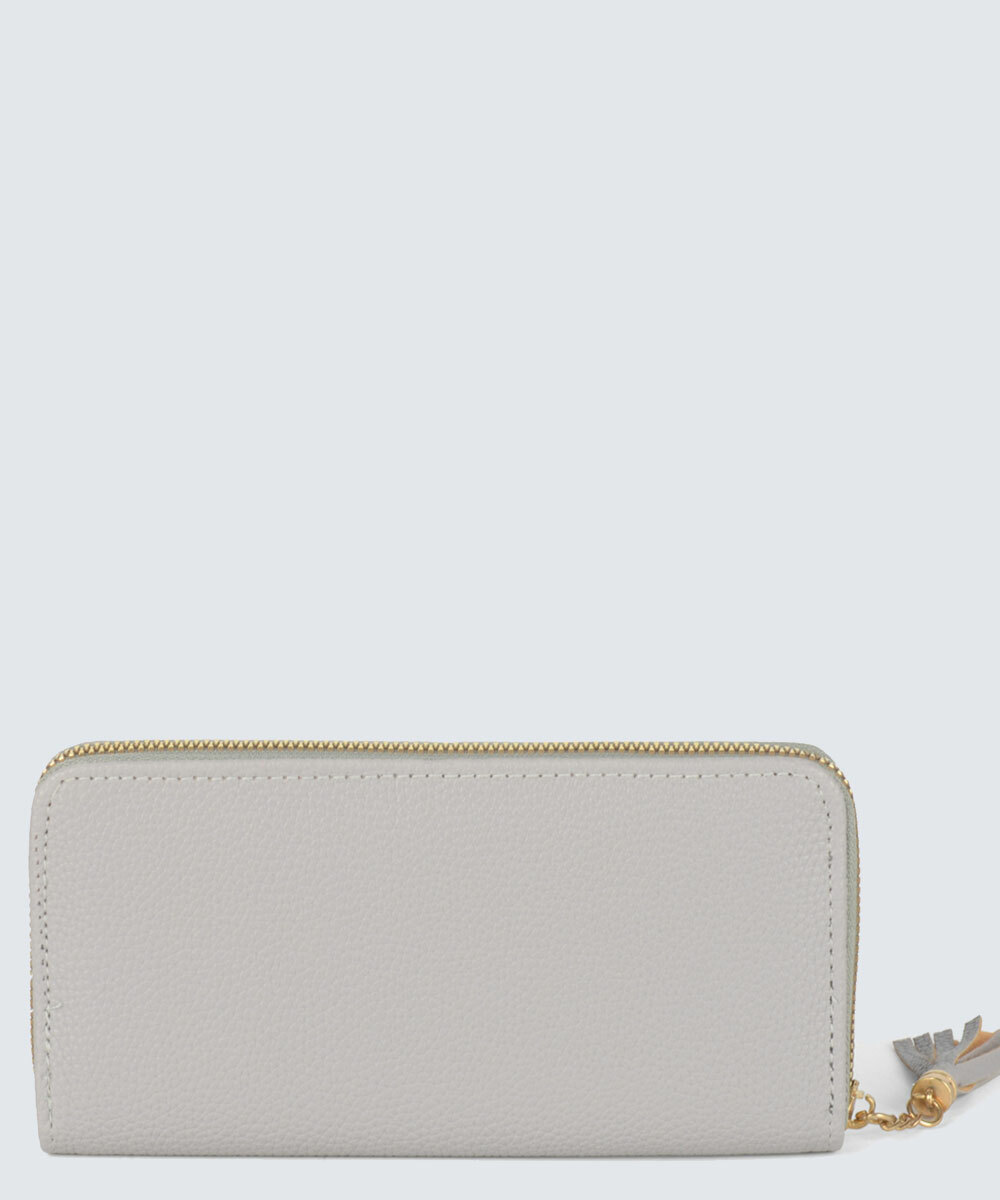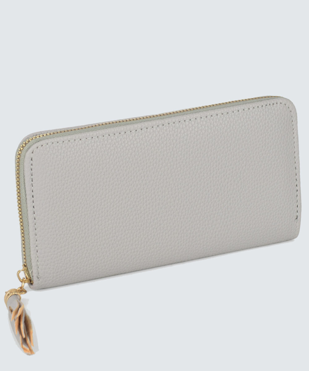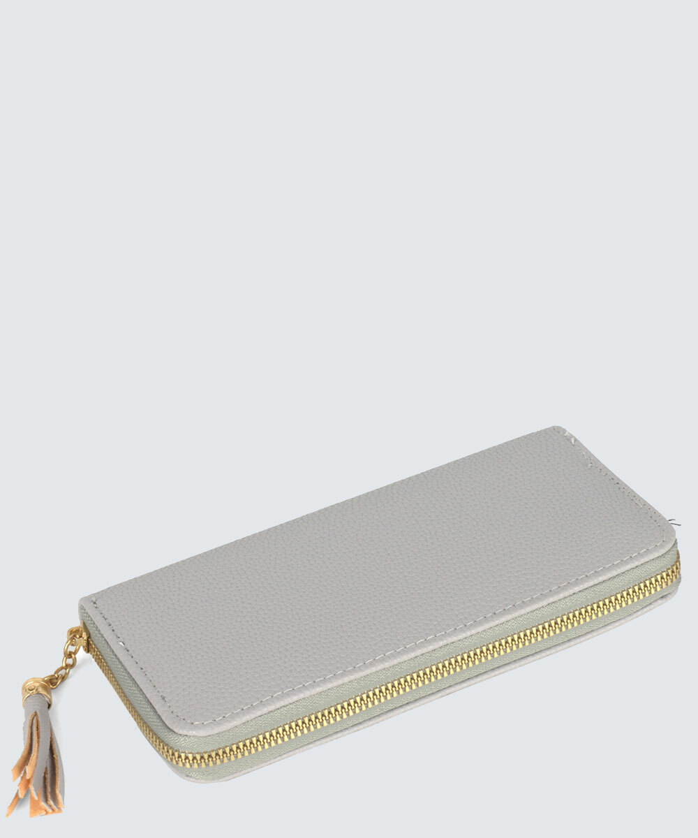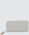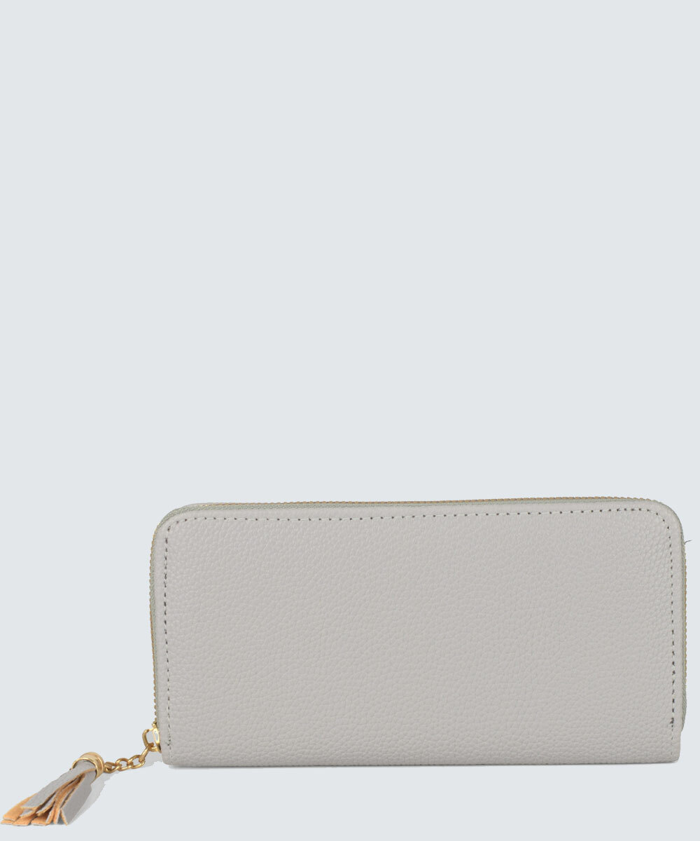 Carteira feminina básica, confeccionada em material sintético com textura. Possui fechamento por zíper, repartição única, compartimento para cartões e documentos, franja decorativa sem remoção, acabamento e costura no tom.