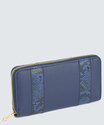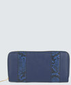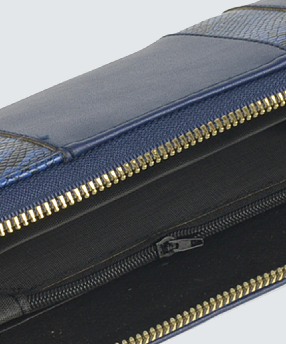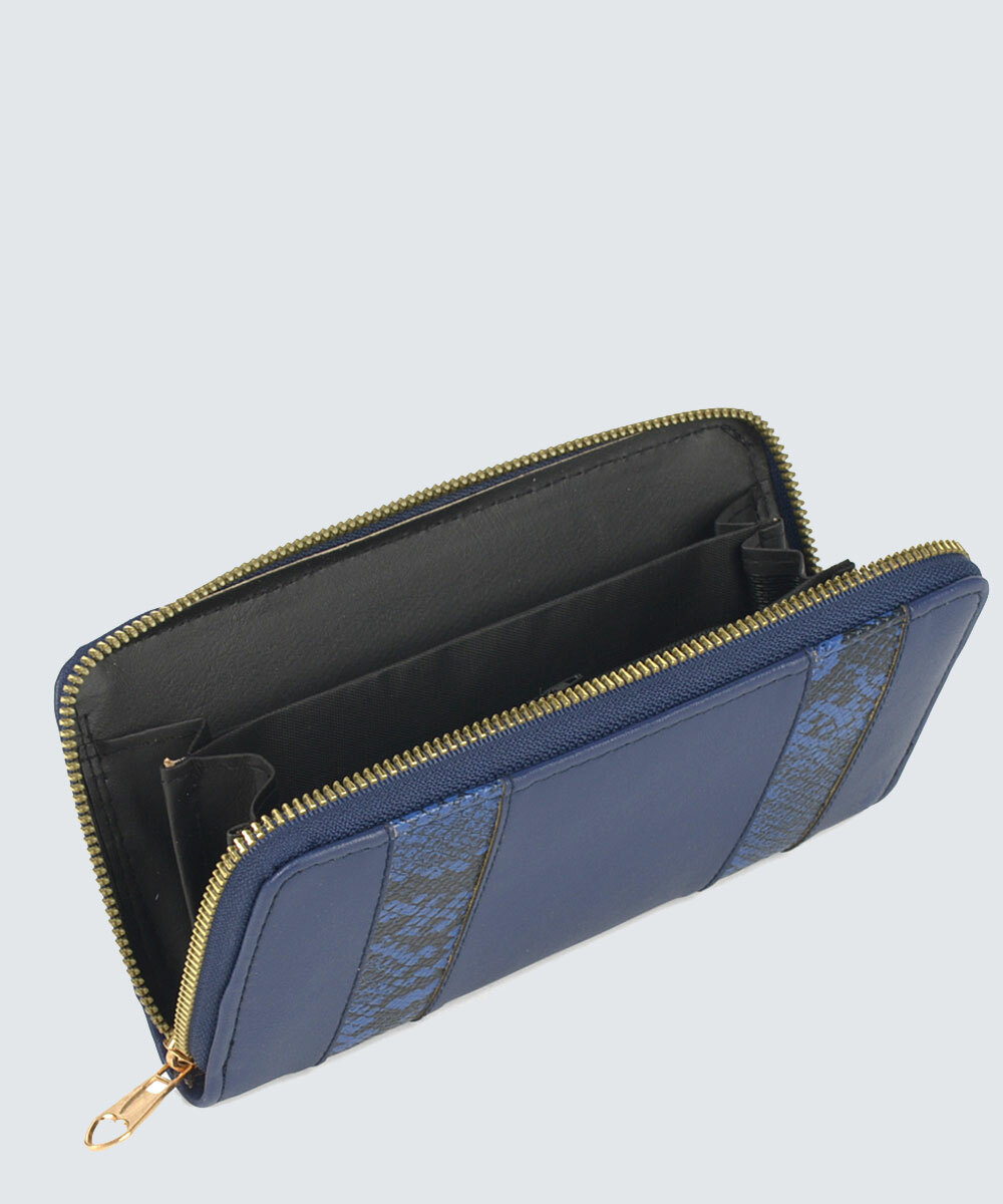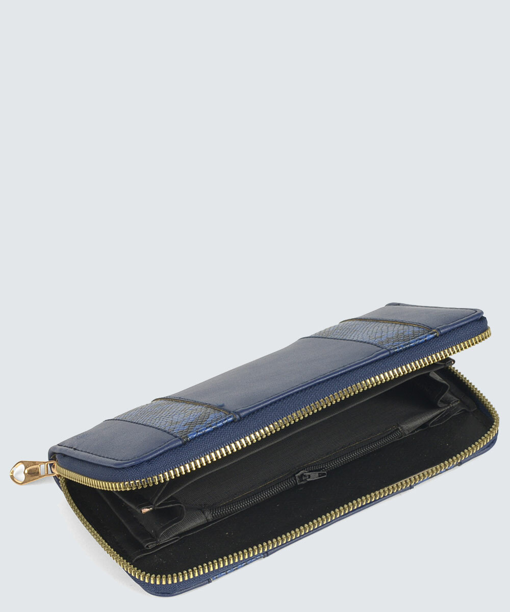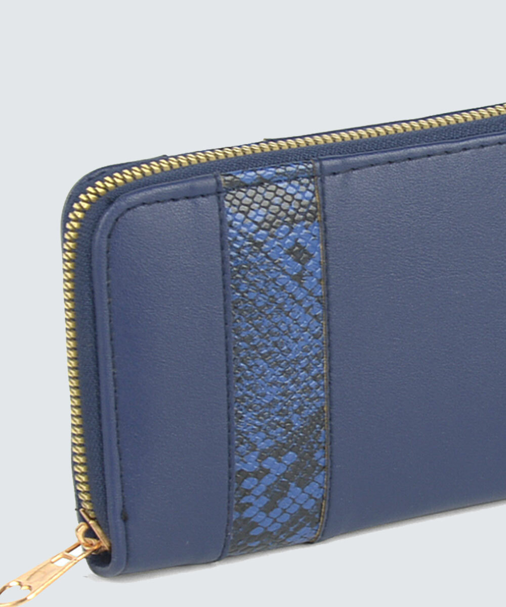 Carteira feminina confeccionada em material sintético com recortes em textura animal print cobra. Possui fechamento por zíper, repartição única, compartimento para cartões e documentos, acabamento e costura no tom.