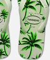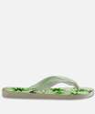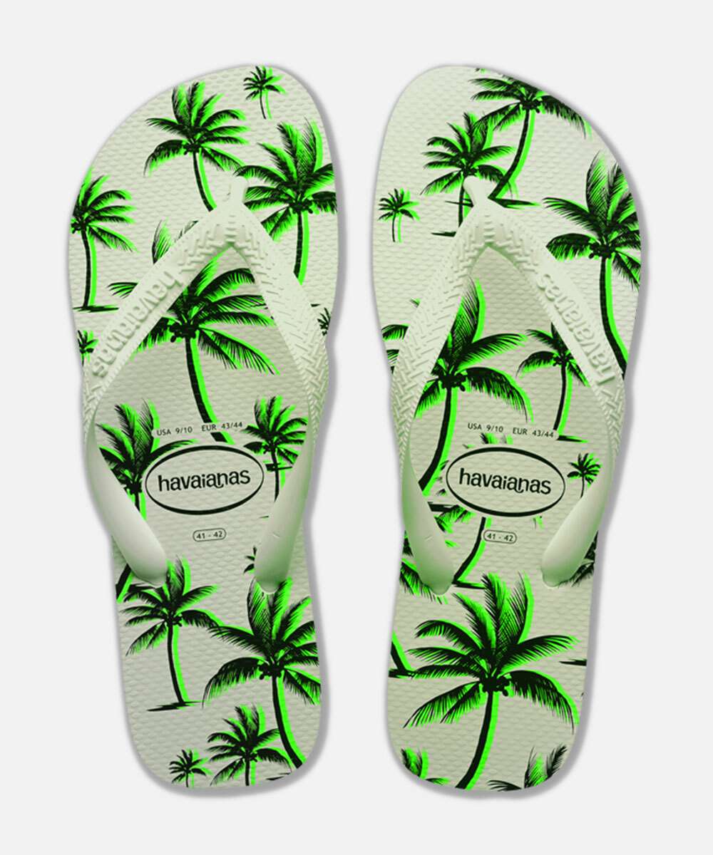 Chinelo masculino, confeccionado em borracha, estampa coqueiros e tiras de dedo com marca em alto relevo.