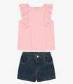 Conjunto Feminino Infantil Blusa Com Shorts Trick Nick composto por blusa em meia malha e shorts jeans. A blusa possui babados franzidos na frente com acabamento delicado, decote e cavas em tecido confortável e barra com costura dupla. O shorts tem cintura com passantes, botão frontal, bolsos funcionais e barra dobrada, garantindo um visual moderno e prático para o dia a dia das meninas. Ideal para compor looks confortáveis e estilosos.