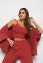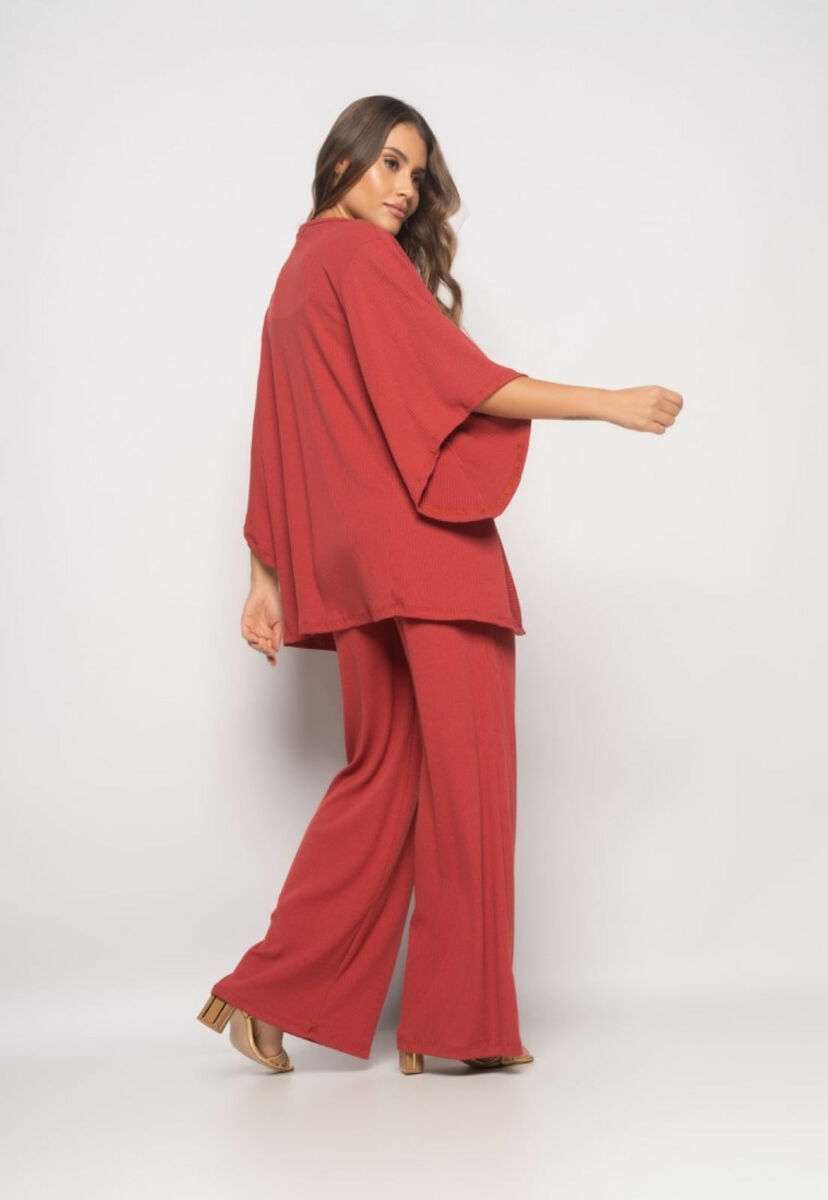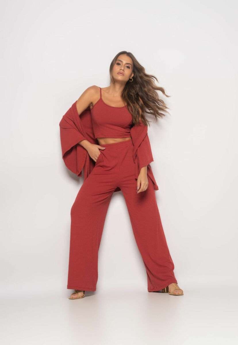 O conjunto é extremamente versátil, perfeito para diversas ocasiões: seja durante o dia ou à noite, em festas, eventos ou até mesmo em saídas mais casuais. Um investimento certeiro para o seu guarda-roupa!O kimono traz uma modelagem ampla e mangas evasê, proporcionando um toque de sofisticação com seu comprimento médio. Já o cropped apresenta um shape justo, com alças finas, realçando a silhueta de forma elegante.A calça, de modelagem wide leg e cintura alta, garante conforto e estilo, com cós elástico e bolsos laterais, criando um look prático e moderno.Tudo isso é confeccionado em um tecido de excelente qualidade, com elasticidade e um toque super macio, garantindo conforto e liberdade de movimento ao longo do dia.Confeccionado em Malha Canelada de ótima qualidade.Confeccionado em malha canelada de alta qualidadeVersátilKimono com mangas evasêCropped de shape justoCalça wide legMedidas da modelo: Altura 1,70cm | Busto 88cm | Cintura 61cm | Quadril 92cm | Manequim 36Modelo veste tamanho PComposição: 63% Poliéster, 34% Viscose, 3% Elastano.