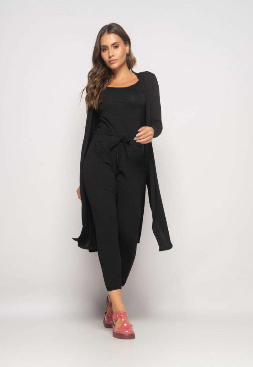 Este conjunto sofisticado combina elegância e conforto em uma peça única.O kimono, com mangas longas e comprimento estendido, traz um toque de classe e estilo, complementado pela fenda lateral que adiciona movimento à peça.A regata, com corte justo e alças finas, valoriza a silhueta de forma discreta e refinada.A calça jogger, de cintura alta e cós elástico, proporciona um ajuste confortável e moderno, com recortes frontais e bolsos laterais que agregam funcionalidade e um charme extra.Confeccionado em um tecido de alta qualidade, com elasticidade e um toque super macio, esse conjunto é perfeito para quem busca conforto e sofisticação em qualquer ocasião.Confeccionado em tecido de alta qualidadeKimonoMangas longasModelo alongadoDetalhes em fendasRegataAlças finasModelagem slimCalçaModelagem JoggerCadarço fakeElástico na barraBolsos lateraisMedidas da modelo: Altura 1,70 – Busto 88 – Cintura 61 – Quadril 92 – Manequim 36Modelo veste PComposição: 96% Viscose, 4% Elastano