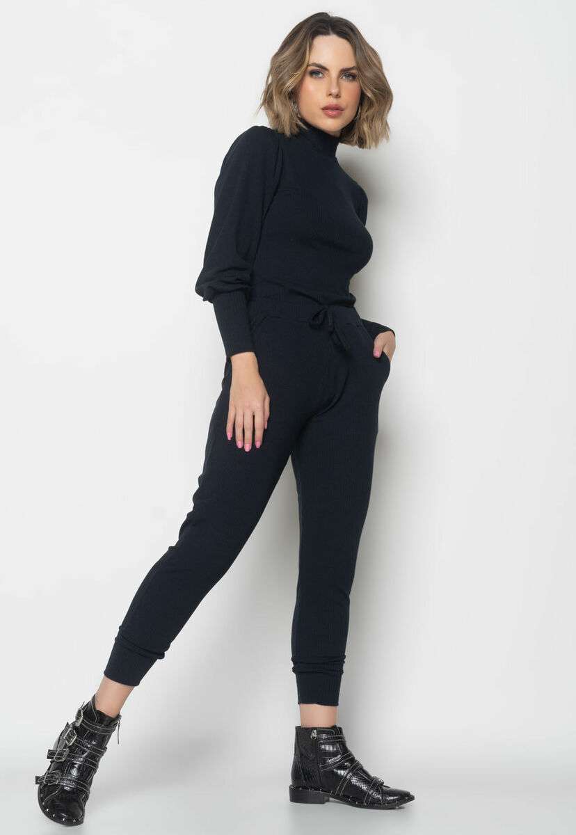 Conjunto Comfy Com Blusa Princesa M/L e Jogger Canelado Preto Salvatore