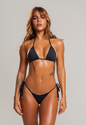 O conjunto de biquíni com lacinho lateral e modelagem fio dental possui acabamento sofisticado e foi pensado para a mulher que valoriza conforto, ajuste perfeito e liberdade ao vestir. O top cortininha conta com pingente central banhado a ouro 18k e dupla amarração, oferecendo regulagem personalizada e sustentação na medida certa. A calcinha com lacinho de amarrar nas laterais acompanha o movimento do corpo, garantindo ajuste sob medida e valorizando a silhueta. Possui forro interno, tecido macio ao toque e elasticidade na medida certa, proporcionando segurança e conforto durante o uso. As ponteiras em metal dourado finalizam os laços do top e da calcinha com toque premium e visual elegante. Versátil e atemporal, o conjunto permite marquinhas mais discretas ou mais marcadas, conforme a regulagem desejada.Uma escolha essencial para acompanhar você na praia, piscina, viagens ou momentos ao ar livre, unindo estética, funcionalidade e estilo. Diferenciais: Design ideal para a marquinha perfeitaTop cortininha com dupla amarração Pingente central banhado a ouro 18kCalcinha com lacinho lateral de amarrarAcabamento em ponteiras douradasProteção UV50+Possui forro internoTecido macio e agradável ao toqueVersátil para praia, piscina, viagens e momentos ao ar livreFácil de combinar com outras peças Especificações: Material: Poliamida LightComposição: 91% poliamida, 9% elastanoProteção: UV50+Modelo: Conjunto top cortininha + calcinha lacinhoCor: PretoIndicação de uso: Praia, piscina e lifestyleMODELO VESTE TAMANHO P Cuidados com a peça:Por se tratar de um tecido delicado, recomendamos cuidado ao vestir e manusear, evitando contato com superfícies ásperas ou objetos pontiagudos que possam puxar fios.Para preservar a beleza e a durabilidade da peça, recomendamos lavagem manual em água fria, com sabão neutro. Não utilizar alvejante, não deixar de molho e secar à sombra. Evite torcer ou usar máquina e secadora.