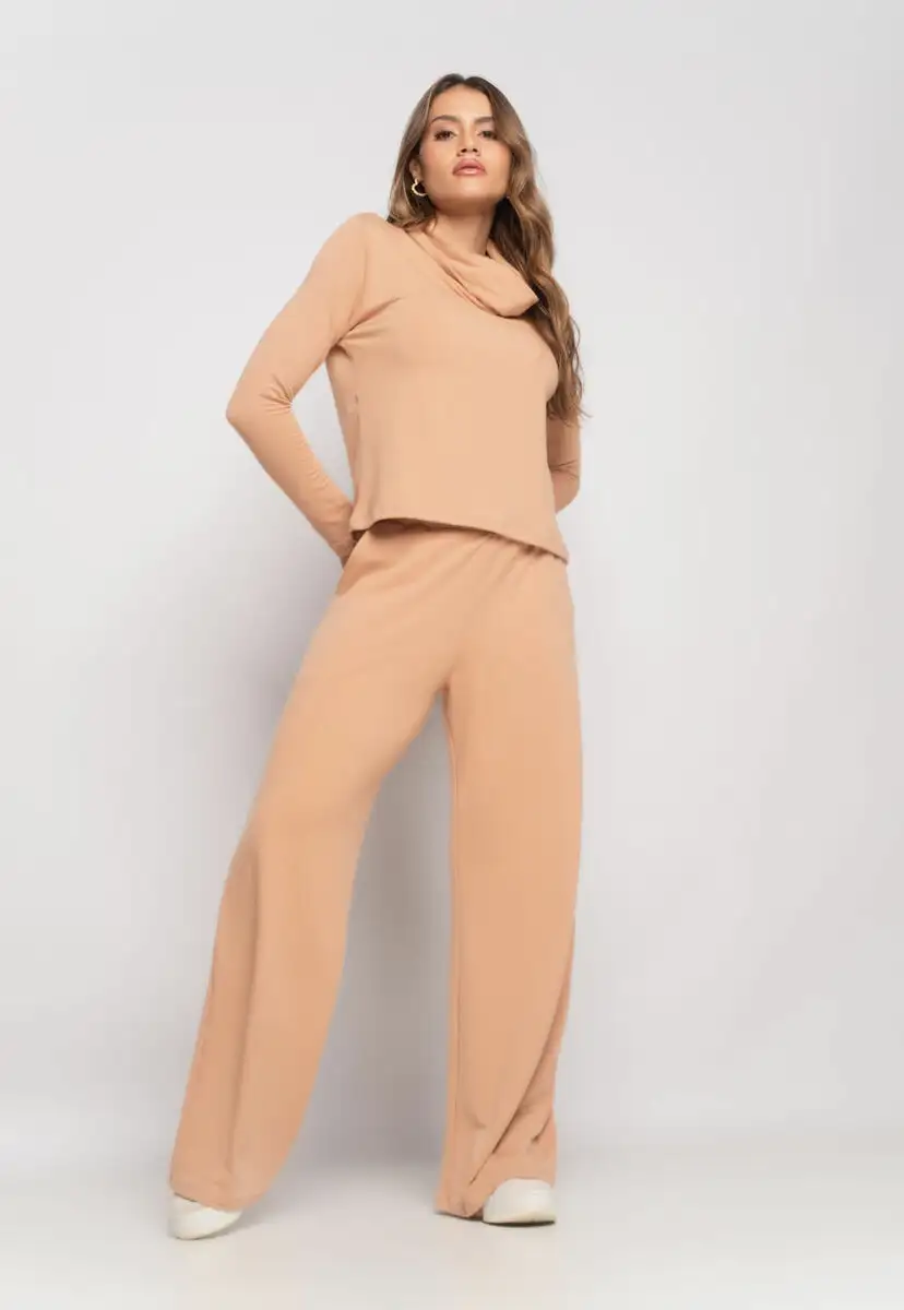Se você busca um look que alie praticidade, elegância e charme, este conjunto é a escolha perfeita!A blusa apresenta um caimento amplo e sofisticado, com mangas longas e uma gola levemente caída, garantindo um toque de modernidade e conforto.Já a calça, com modelagem wide leg e cintura alta, valoriza a silhueta e proporciona um visual alongado e imponente. O cós elástico assegura um ajuste perfeito ao corpo, enquanto os bolsos laterais agregam funcionalidade e estilo.Confeccionado em um tecido de alta qualidade, este conjunto oferece excelente elasticidade e um toque incrivelmente macio, tornando-o ideal para quem deseja unir sofisticação e bem-estar em qualquer ocasião.BlusaModelagem AmplaMangas LongasModelo Gola CaídaCalçaModelagem Wide LegCós com ElásticoBolsos LateraisMedidas da modelo: Altura 1,70cm | Busto 88cm | Cintura 61cm | Quadril 92cm | Manequim 36.Modelo veste PComposição: 63% Poliéster, 34% Viscose, 3% Elastano.