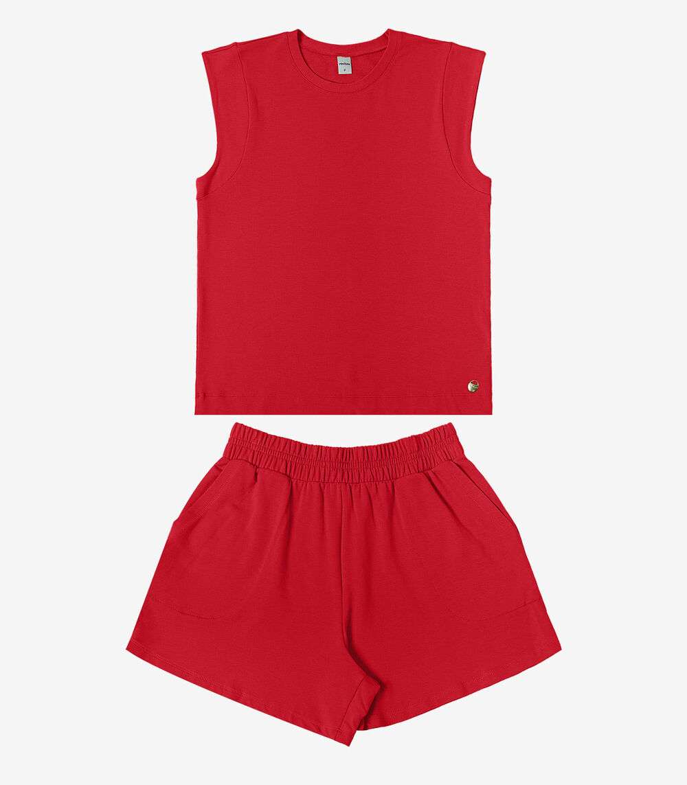 Confeccionado em Molecotton de Viscose, o conjunto traz uma regata com decote moldado e detalhe diferenciado nas costas, além de plaquinha decorativa e acabamento com bainha. O shorts possui cós com elástico largo para mais conforto e bolsos internos com costura arredondada. Ideal para momentos de lazer com estilo e praticidade.