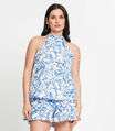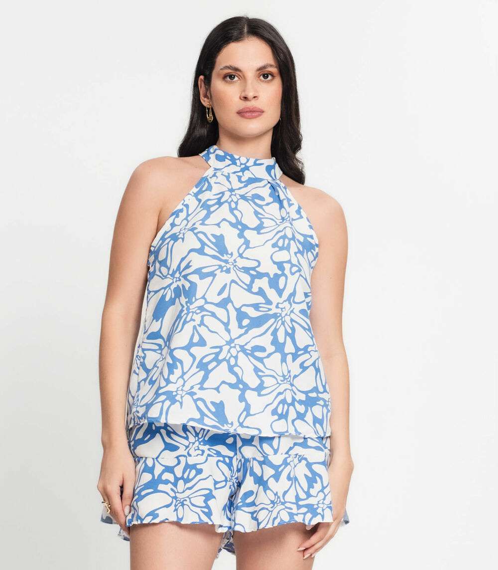 Conjunto Feminino Regata E Shorts Estampado Select, conjunto Curto é composto por um shorts soltinho com elástico na cintura e cordão decorativo, e uma blusa regata feminina com laço no pescoço. Feito de tecido leve e confortável, é ideal para dias quentes, proporcionando um visual moderno e elegante.