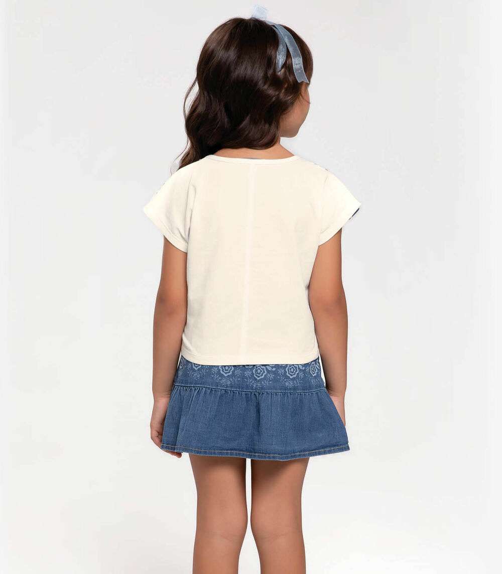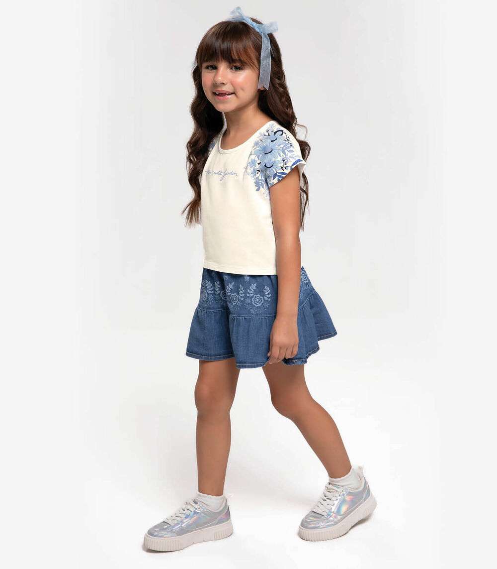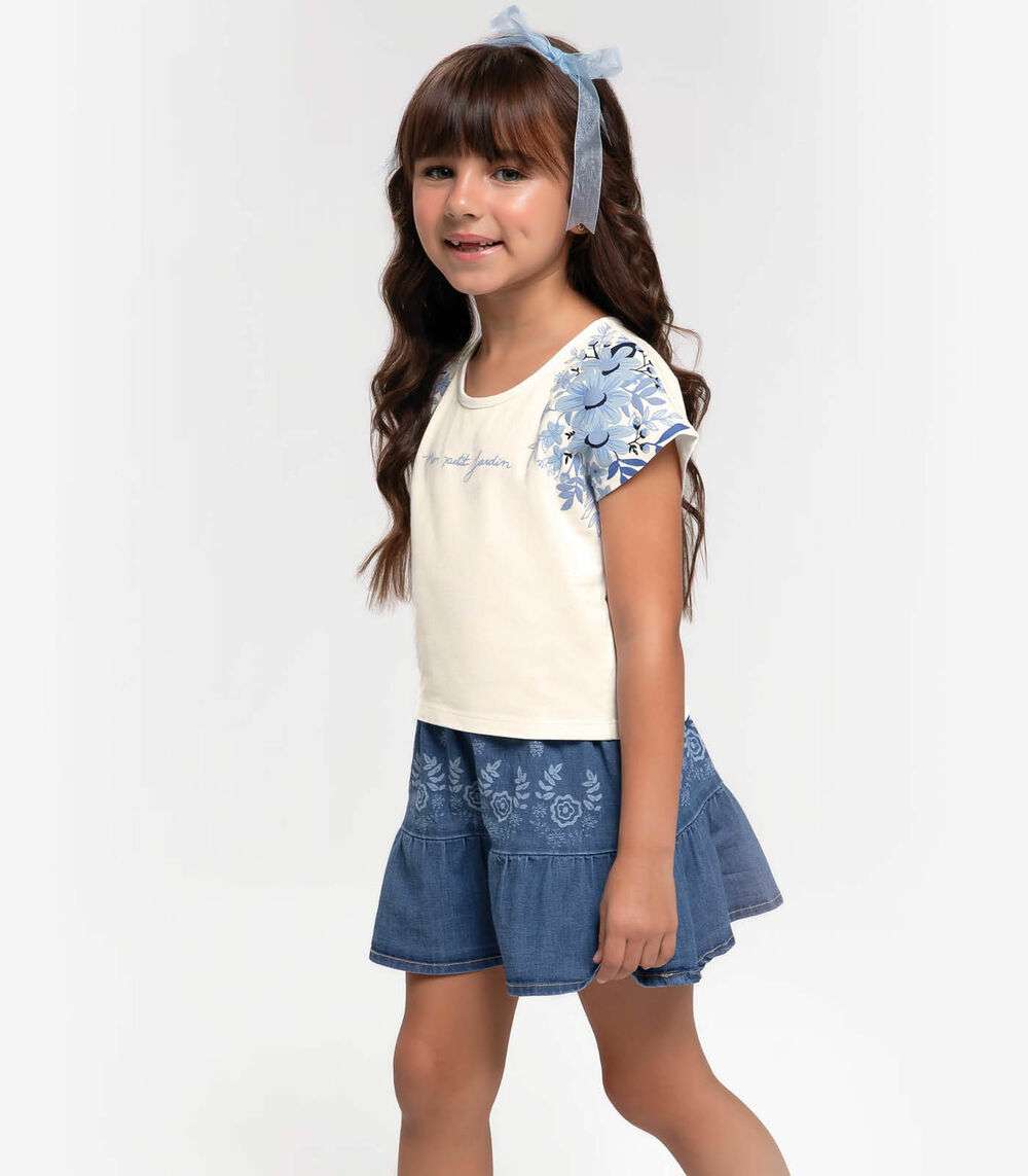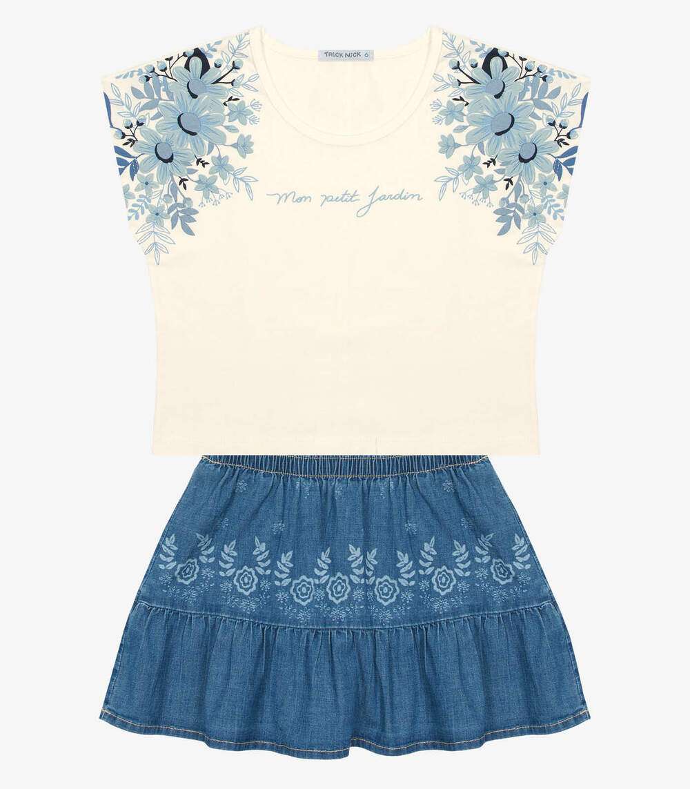 O Conjunto Infantil Blusa com Saia Jeans Trick Nick combina conforto e estilo com charme. A blusa, feita de cotton leve, apresenta uma estampa localizada nas mangas que adiciona um toque moderno. A saia, confeccionada em jeans rize, possui cós com elástico para ajuste confortável e um babado com franzido que proporciona um visual encantador e feminino. Ideal para diversas ocasiões, o conjunto oferece uma combinação perfeita de praticidade e moda para as pequenas.