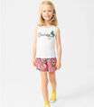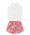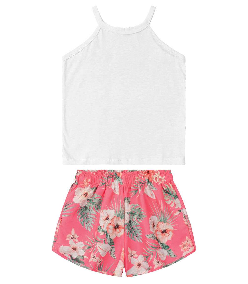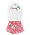 Conjunto Infantil Feminino, composto por blusa e shorts. Blusa desenvolvida em Meia Malha, com alças fixas e gola redonda; possui estampa localizada com desenho de flor e a palavra "Charme" em inglês. Shorts desenvolvido em Microfibra com estampa rotativa floral; possui elástico no cós. A dupla ideal para passeios ao ar livre! Combine com: tênis e jaqueta.