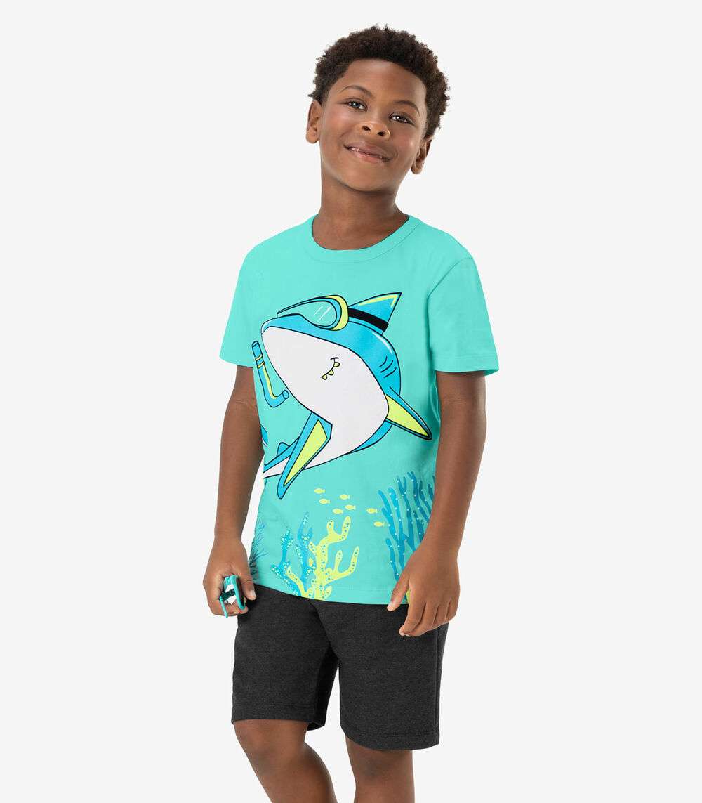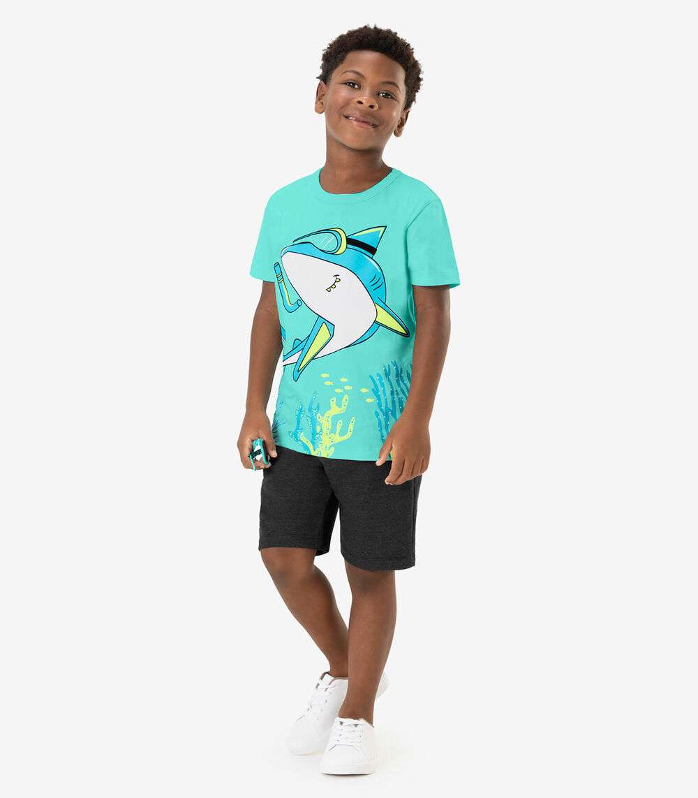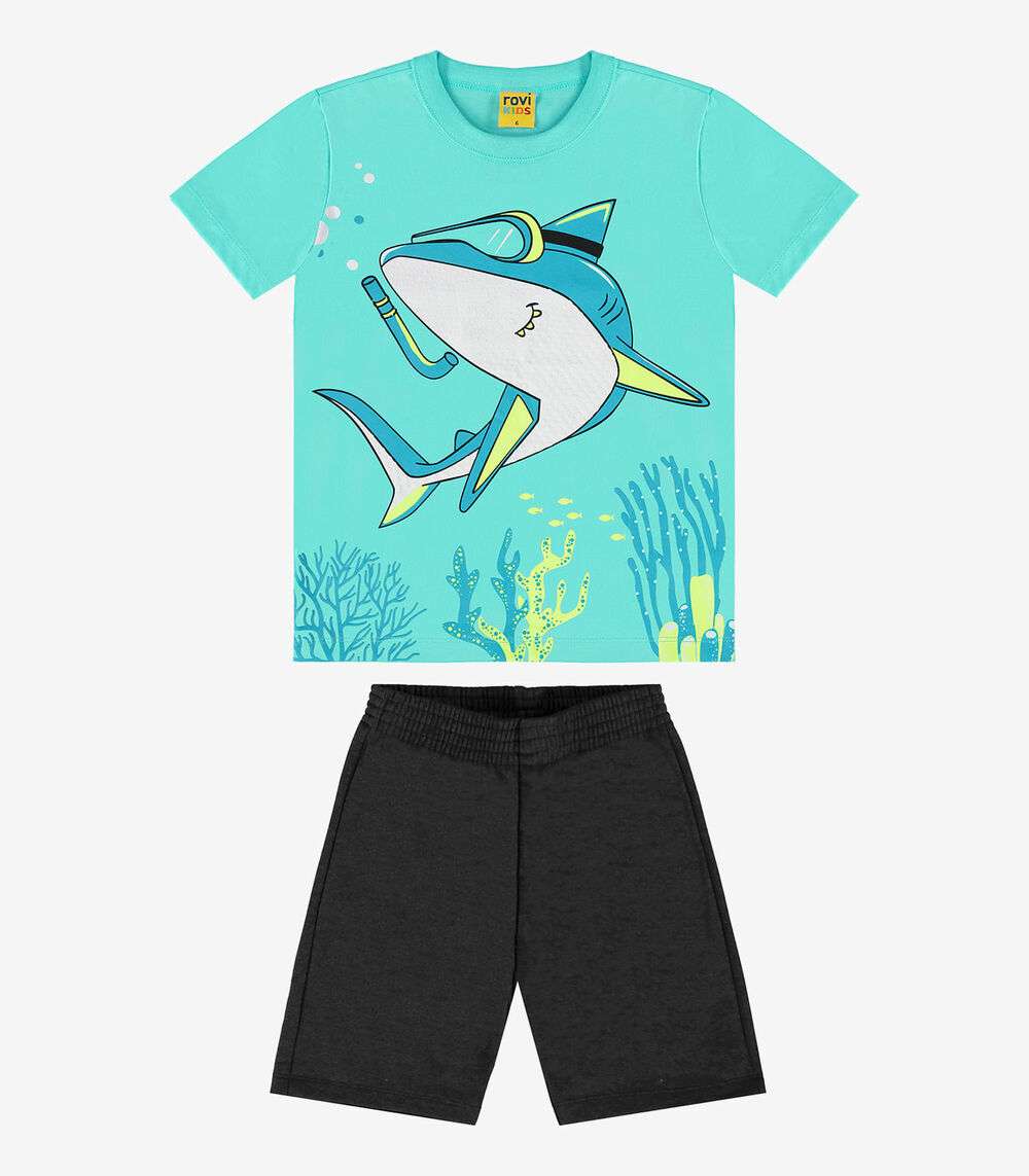 O Conjunto Infantil Masculino Rovi Kids combina conforto e estilo em um design divertido. Feito em meia malha e moletom PA, a camiseta se destaca com uma estampa vibrante de tubarão, perfeita para os pequenos que amam aventuras marítimas. A bermuda, com cós elástico, oferece um ajuste confortável e flexível, ideal para atividades e brincadeiras diárias. Este conjunto é uma escolha prática e estilosa para o dia a dia dos meninos, garantindo liberdade de movimento e um visual moderno.