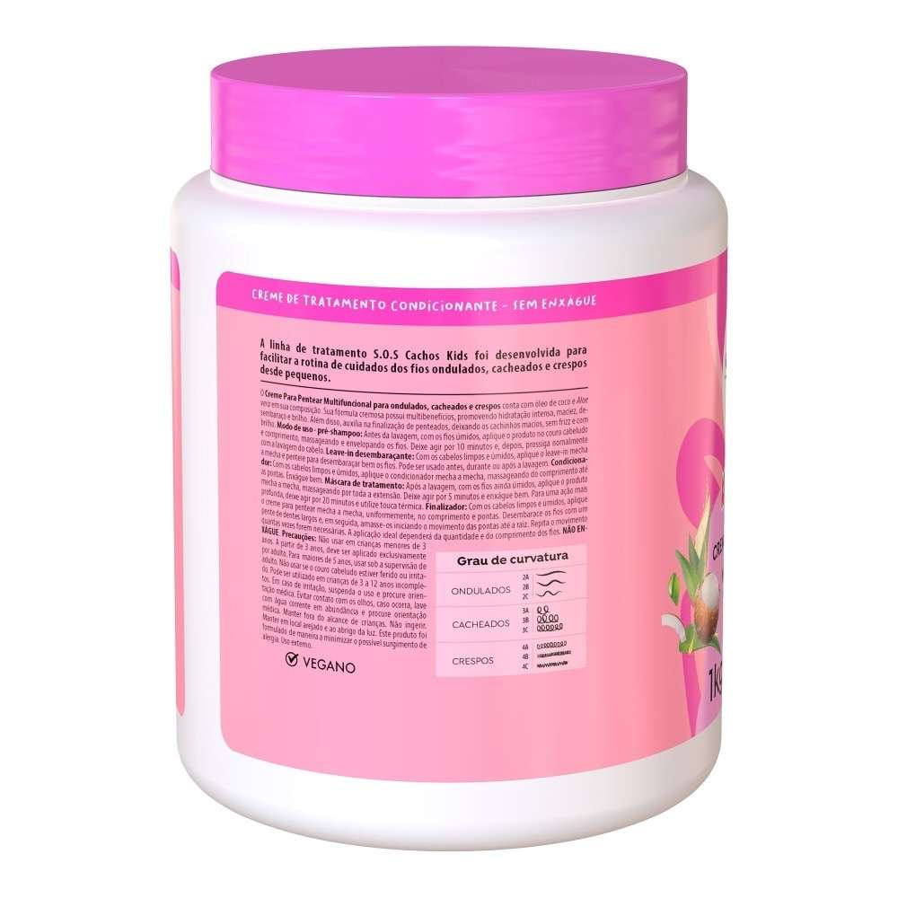 O Creme para Pentear Multifuncional 5 em 1 S.O.S Cachos Kids promove hidratação intensa, maciez, desembaraço e brilho. Além disso, auxilia na finalização de penteados, deixando os cachinhos macios, sem frizz e com brilho. É hipoalergênico e dermatologicamente testado. Para quais tipos de cabelo? Cabelos ondulados, cacheados e crespos. Qual a indicação? Para cabelos desidratados e com frizz. Pode usar a partir de quantos anos?A partir de 03 anos. Quais os principais ativos?O Creme para Pentear Multifuncional 5 em 1 S.O.S Cachos Kids possui fórmula enriquecida com óleo de coco e aloe vera que mantém a hidratação, controla o frizz e dá muito brilho. Qual a melhor forma de usar?O Creme para Pentear Multifuncional 5 em 1 S.O.S Cachos Kids pode ser usado de 5 formas: Pré-shampoo: Antes da lavagem, com os fios úmidos, aplique o produto no couro cabeludo e comprimento, massageando e enluvando-os bem. Deixe agir por 10 minutos e, depois, prossiga normalmente com a lavagem do cabelo. Leave-in desembaraçante: Com os cabelos limpos e úmidos, aplique o leave-in mecha a mecha e penteie para desembaraçar bem os fios. Pode ser usado antes, durante ou após a lavagem. Condicionador: Com os cabelos limpos e úmidos, aplique o condicionador mecha a mecha, massageando do comprimento até as pontas. Enxágue bem. Máscara de tratamento: Após a lavagem, com os fios ainda úmidos, aplique o produto mecha a mecha, massageando por toda a extensão. Deixe agir por 5 minutos e enxágue bem. Para uma ação mais profunda, deixe agir por 20 minutos. Finalizador: Com os cabelos limpos e úmidos, aplique o creme para pentear mecha a mecha, uniformemente, no comprimento e pontas. Desembarace os fios com um pente de dentes largos e, em seguida, amasse-os iniciando o movimento das pontas até a raiz. Repita o movimento quantas vezes forem necessárias. A aplicação ideal dependerá da quantidade e do comprimento dos fios. É produto vegano? O Creme para Pentear Multifuncional 5 em 1 S.O.S Cachos Kids é vegano.