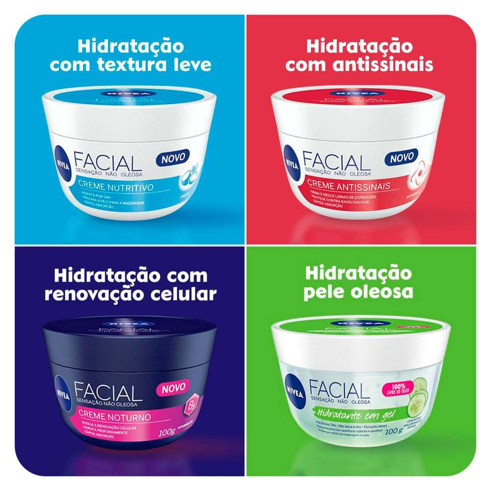 Nivea Creme Facial Nutritivo, sua fórmula ultra leve com tecnologia Hydro-Waxes à base de água e Karité, proporciona hidratação intensa por 24horas sem deixar sensação oleosa e ainda prepara a pele para a maquiagem, para uma pele bonita e com aspecto saudável.Benefícios: - Hidratação por 24h - Prepara a pele para a maquiagem - Sensação não oleosa - Fórmula leve de rápida absorção Precauções: Uso externo. Evite contato com os olhos. Caso aconteça, enxágue com água em abundância. Em caso de irritação, suspenda o uso e procure orientação médica.Manter em local seco e arejado, ao abrigo de luz e fora do alcance de crianças. Este produto não é um protetor solar.