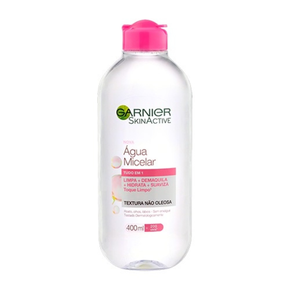A Água Micelar Tudo em 1 SkinActive de Garnier é a solução de limpeza completa para todos os tipos de pele. Com tecnologia micelar, ela limpa, demaquila, hidrata e suaviza em um só gesto, sendo o demaquilante Nº1 do mundo. Ideal para uma rotina diária prática e eficaz. O que é e para que serve?Desenvolvida para simplificar sua rotina de cuidados, a Água Micelar Garnier SkinActive remove impurezas, maquiagem e oleosidade sem agredir. Sua tecnologia é inspirada em produtos dermatológicos, com micelas que agem como ímãs, capturando a sujeira de forma eficaz. O resultado é uma pele perfeitamente limpa, fresca e hidratada, com uma agradável sensação de pele nua, sem ficar oleosa. A fórmula com 0% de álcool é suave e adequada para uso diário, de manhã e à noite, em todos os tipos de pele, inclusive as mais sensíveis, garantindo um cuidado completo e delicado. Quais os benefícios da Água Micelar de Limpeza Garnier SkinActive Tudo Em 1?- Limpa profundamente e demaquila com eficácia, removendo impurezas e poluição sem esforço.- Hidrata a pele instantaneamente, deixando uma sensação de conforto e maciez ao toque.- Suaviza a pele, sendo ideal para todos os tipos, inclusive as mais sensíveis, por não ter álcool.- Controla a oleosidade, proporcionando um acabamento mate e uma sensação de pele fresca.- Proporciona uma sensação de pele nua, perfeitamente limpa e pronta para os próximos passos. Modo de uso:Aplique o produto sobre um algodão, de manhã e à noite. Passe suavemente sobre o rosto, olhos e lábios, sem a necessidade de esfregar ou enxaguar. Para uma limpeza ainda mais delicada, pode aplicar com as mãos e massagear em movimentos circulares. Descubra o poder da limpeza micelar e transforme sua rotina de cuidados com a Água Micelar Nº1 do mundo!