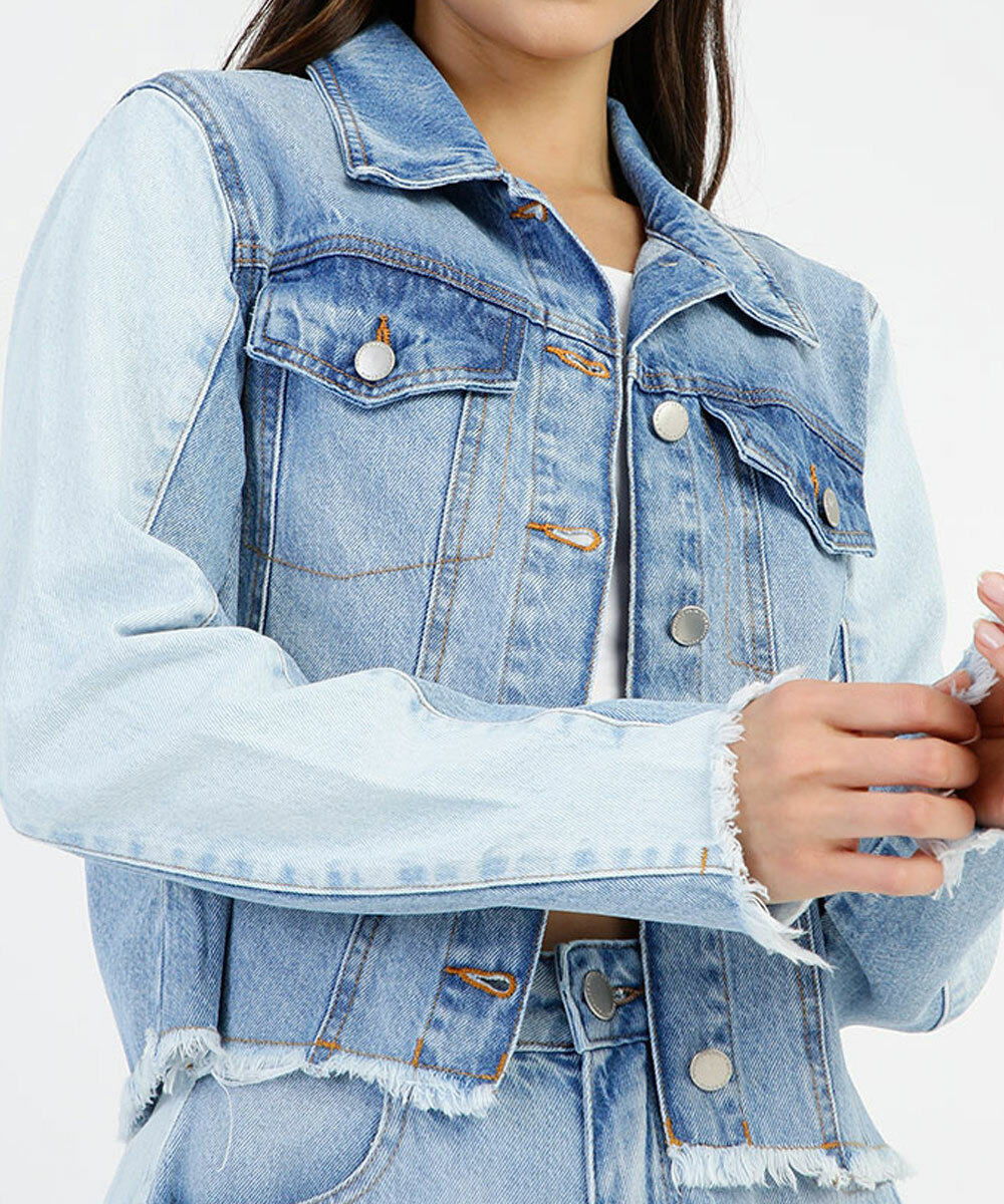 Jaqueta feminina confeccionada em tecido plano jeans. Possui fechamento por botões no entremeio, gola dobrável, manga longa desfiada, bolsos frontais lapela falsos, barra desfiada, recortes em tom contrastante, acabamento e costura em tom constrastante.