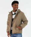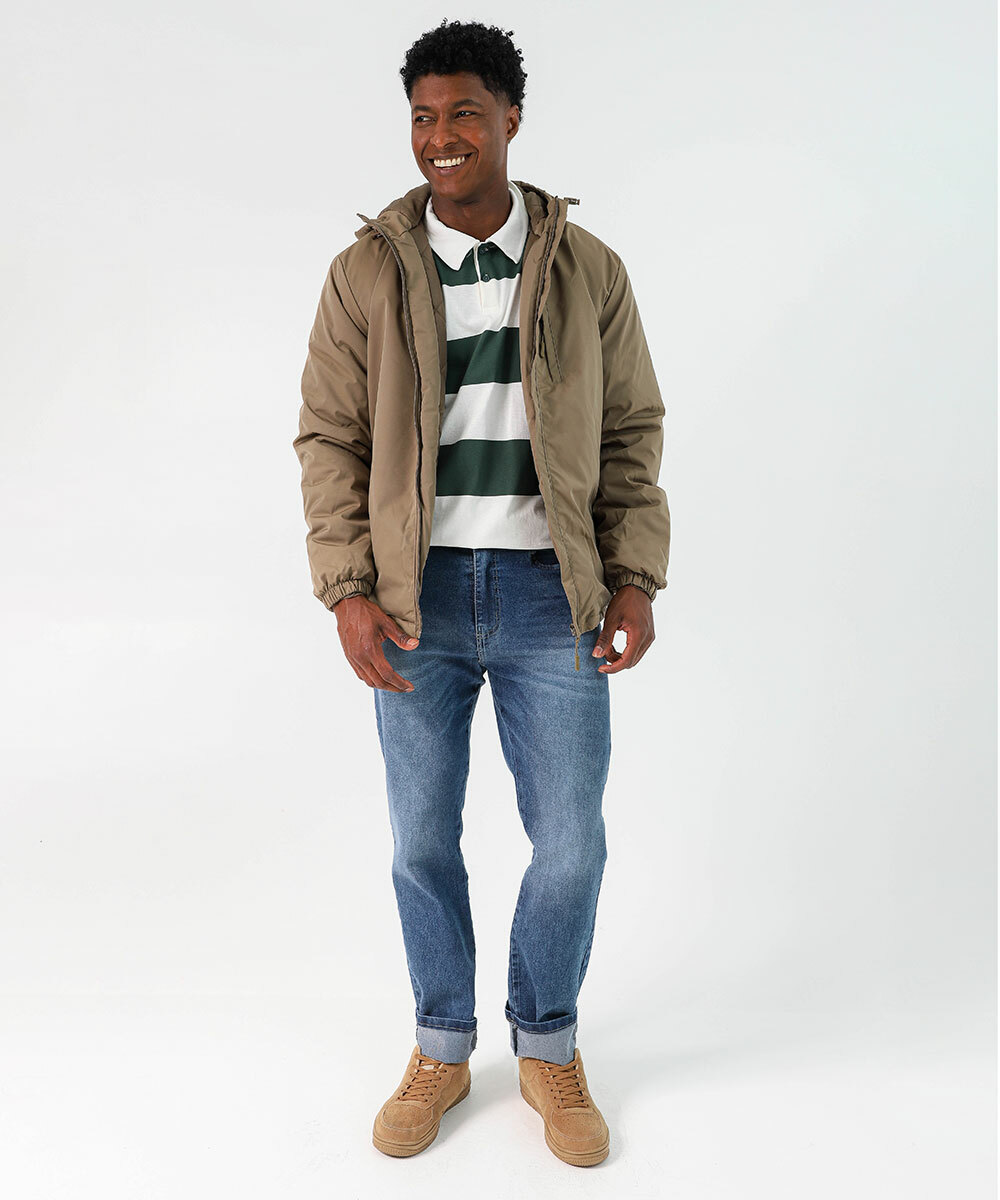 A jaqueta masculina bege com capuz é perfeita para quem busca praticidade e estilo em uma única peça. Com design moderno e cor neutra, combina facilmente com diversos looks, do casual ao urbano.