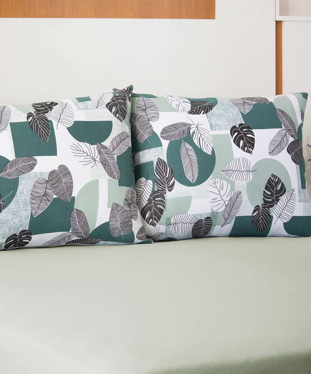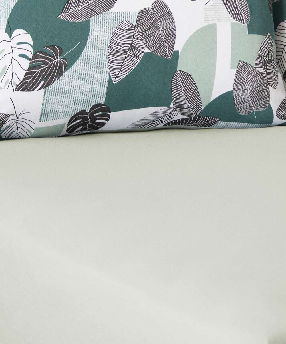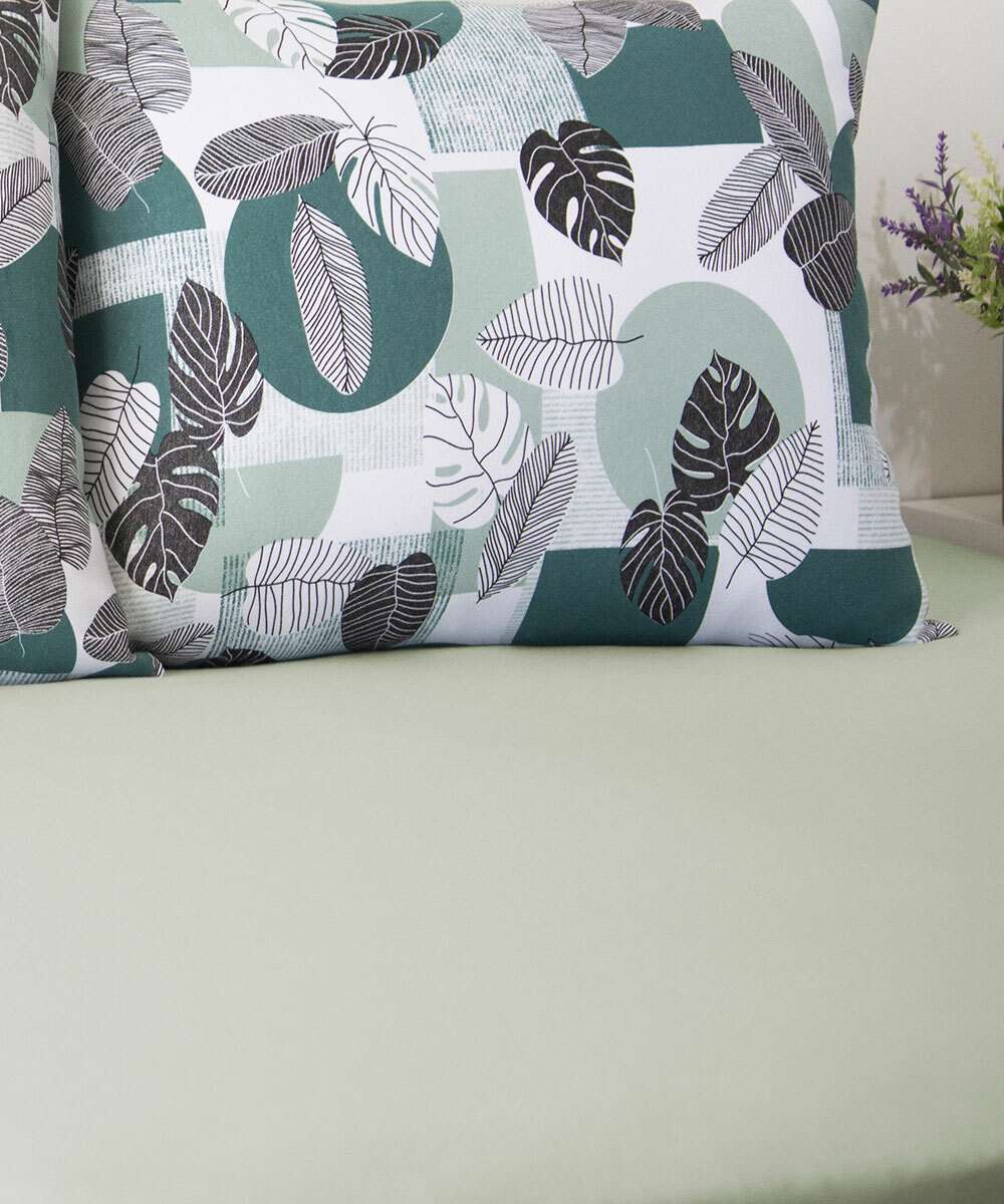 Jogo de cama, composto por lençol de baixo com elástico e duas fronhas, confeccionados em malha algodão e poliéster. Possui estampa de folhas, acabamento ultra macio, práticos e com maior durabilidade.