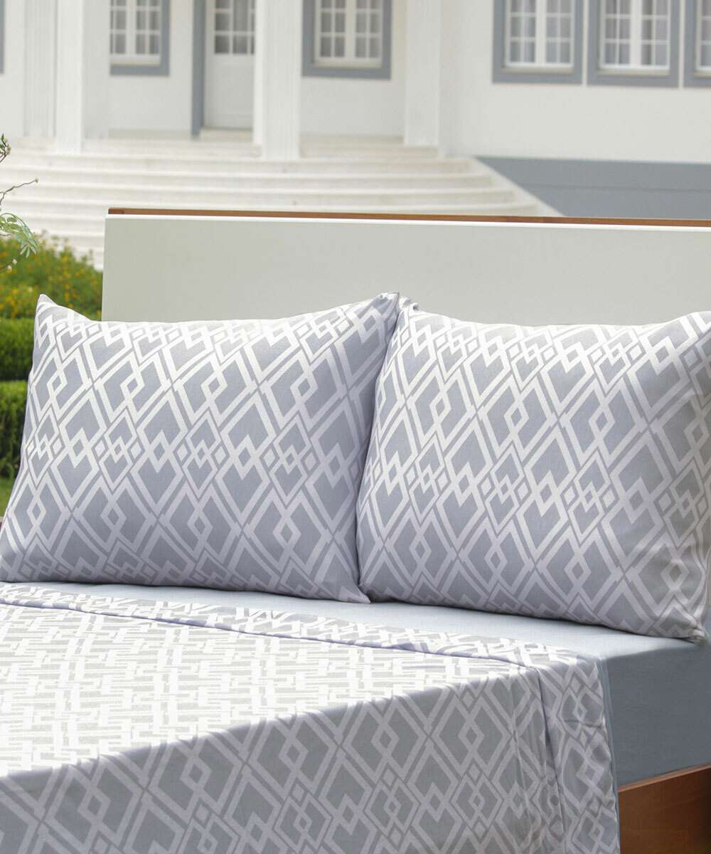 Jogo de cama solteiro, composto por lençol de cima, lençol de baixo com elástico e uma fronha, confeccionados em malha 60% poliéster e 40% algodão com estampa geométrica. Possui acabamento ultra macio, práticos e com maior durabilidade.