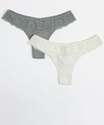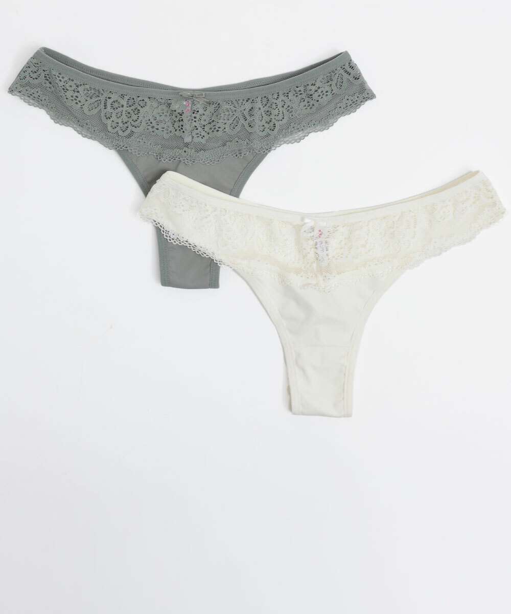 Kit feminino, composto por duas calcinhas, modelo fio dental confeccionadas em microfibra. Possui recorte em renda, laço decorativo no entremeio, forro em algodão, acabamento e costura no tom