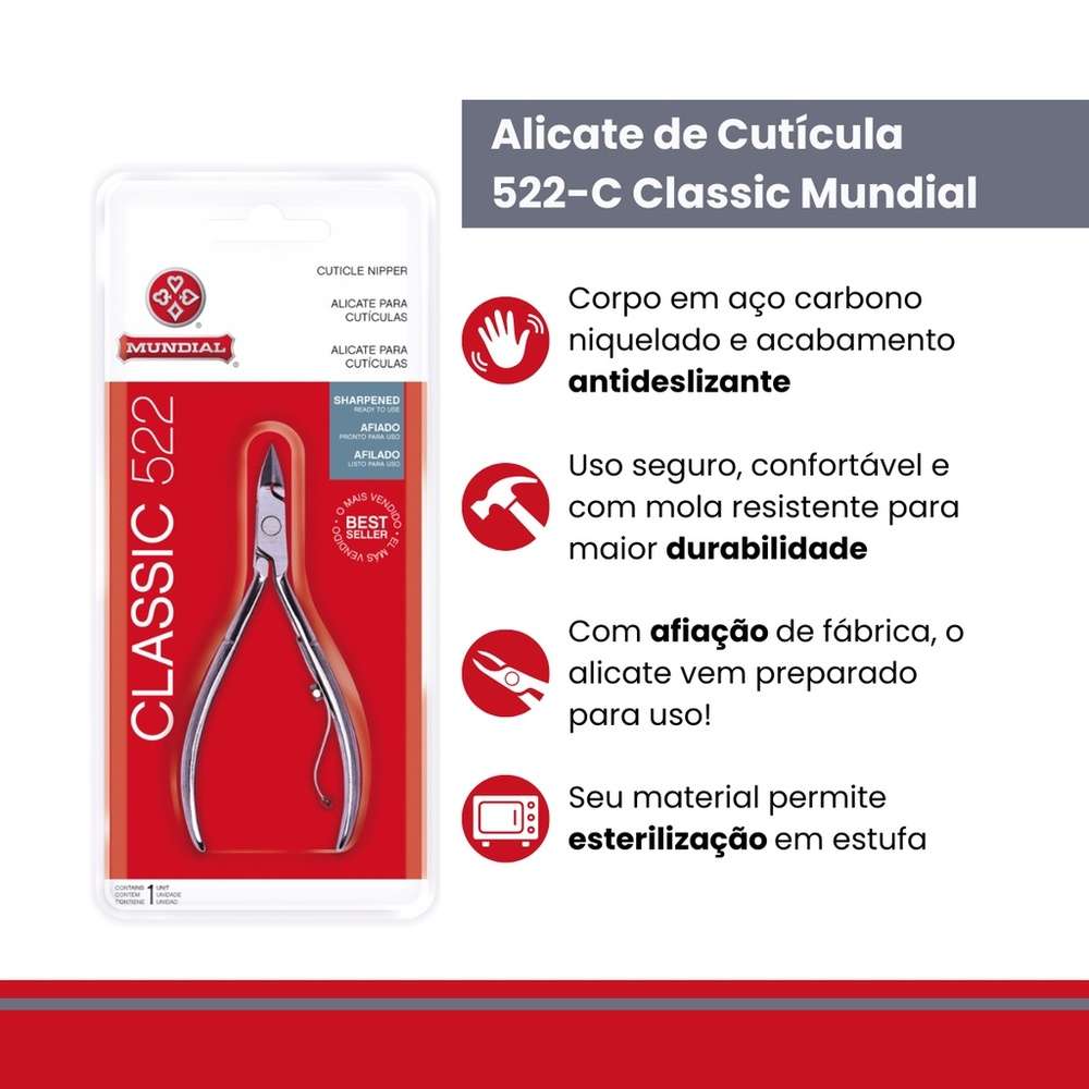 Kit com 3 Alicates de Cutículas 522-CCom corpo em aço carbono niquelado e acabamentoantideslizante, permite um uso seguro, confortável e com mola resistente paramaior durabilidade. Seu material permite esterilização em estufa, com afiaçãode fábrica preparada para uso!O alicate 522-c éideal para uso profissional, podendo ser utilizado para o corte de cutículas emunhas de todos os tipos; é uma ótima escolha para profissionais que buscam umaferramenta de qualidade e durabilidade. Ele é seguro, confortável e fácil delimpar.O alicate possuium corpo em aço carbono niquelado e acabamento antideslizante, que garante umuso confortável e seguro. A mola resistente também contribui para adurabilidade do produto.O material doalicate permite a esterilização em estufa, o que é importante para manter ahigiene no ambiente de trabalho. O alicate já vem afiado de fábrica, prontopara o uso.Algumas dicas parausar o alicate 522-c: Antes de usar,certifique-se de que o alicate esteja bem afiado.Use o alicate comcuidado para não machucar as cutículas.Após o uso, lave oalicate com água e sabão e deixe-o secar naturalmente.Esterilize oalicate regularmente para manter a higiene. Material: AçoCarbonoCabo:TradicionalComprimento: 19 CmEsterilização:Estufa Importante: não higienizar com água fervente, águasanitária, detergente enzimático ou qualquer produto que contenha ácido ouabrasivo. Estes elementos agridem o aço do alicate, danificando-o. Atenção:Não pode ir na Autoclave