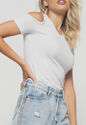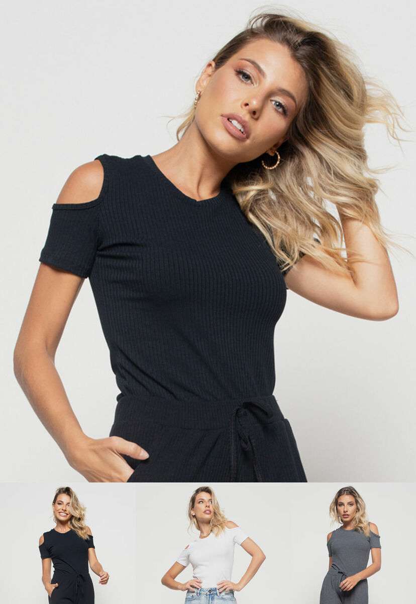 Kit 3 Blusas Ombro Vazado Malha Canelada Preta, Branca e Grafite