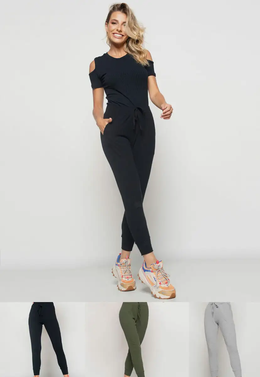 Kit 3 Calças Jogger Comfy Malha Canelada Preta, Verde e Mescla