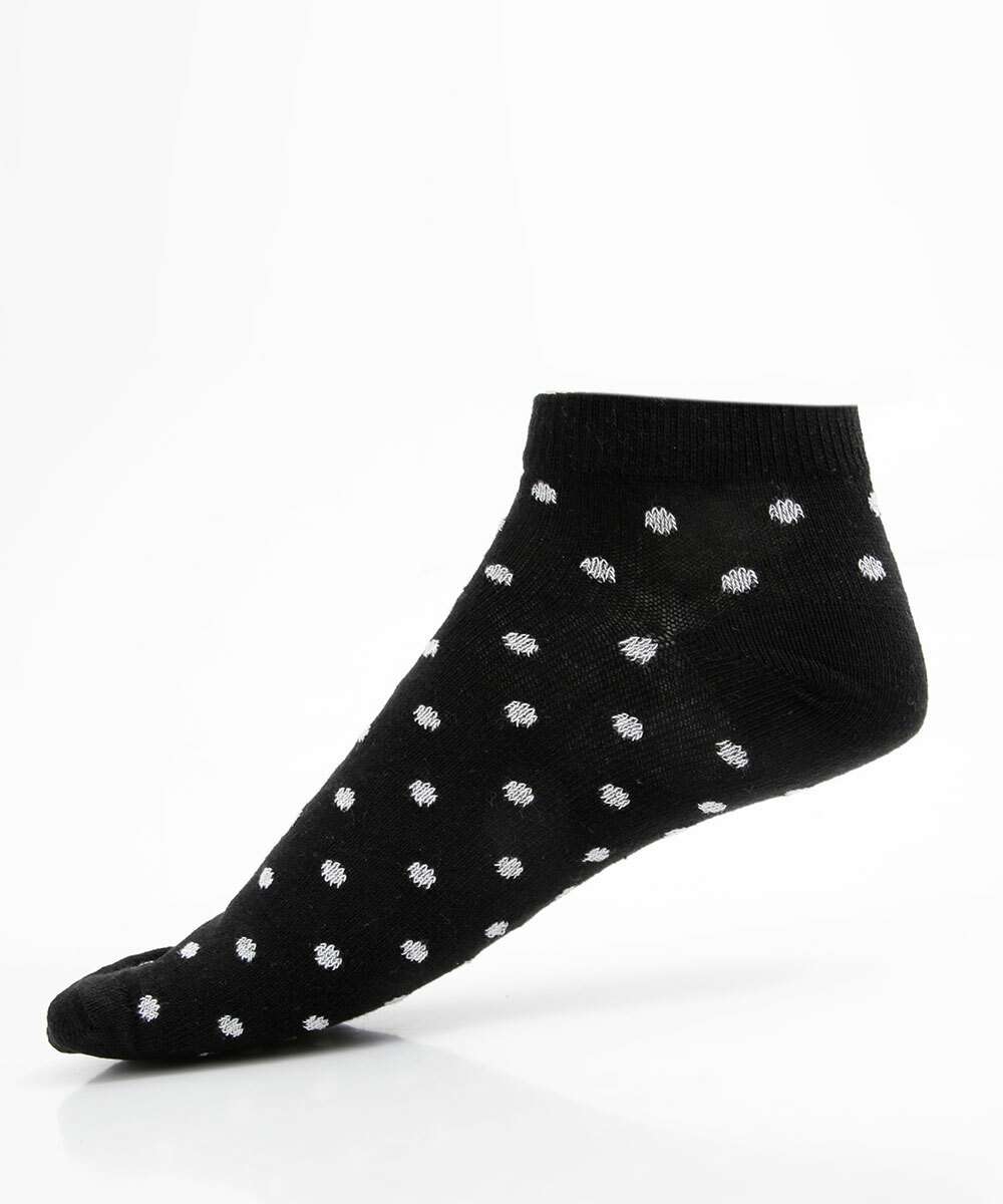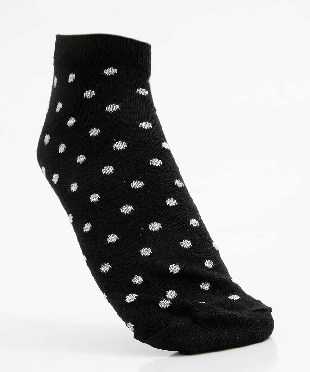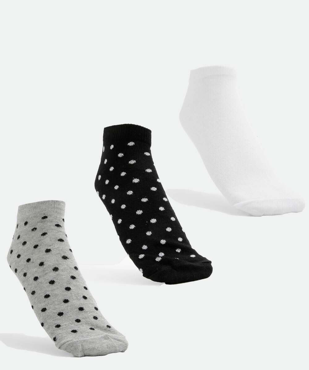 Kit feminino, composto por três pares de meias, modelo cano curto confeccionadas em malha. Possui um par liso, e dois pares com estampa poá, acabamento e ribana e costura no tom.