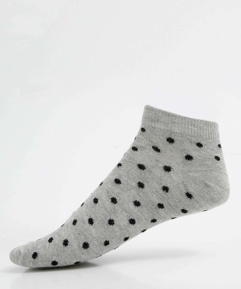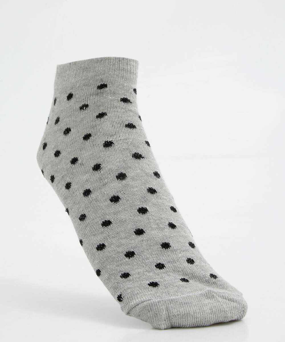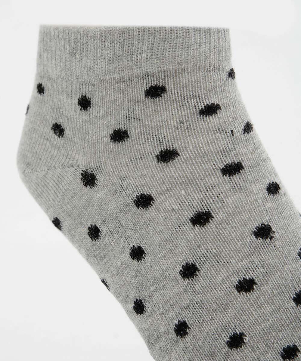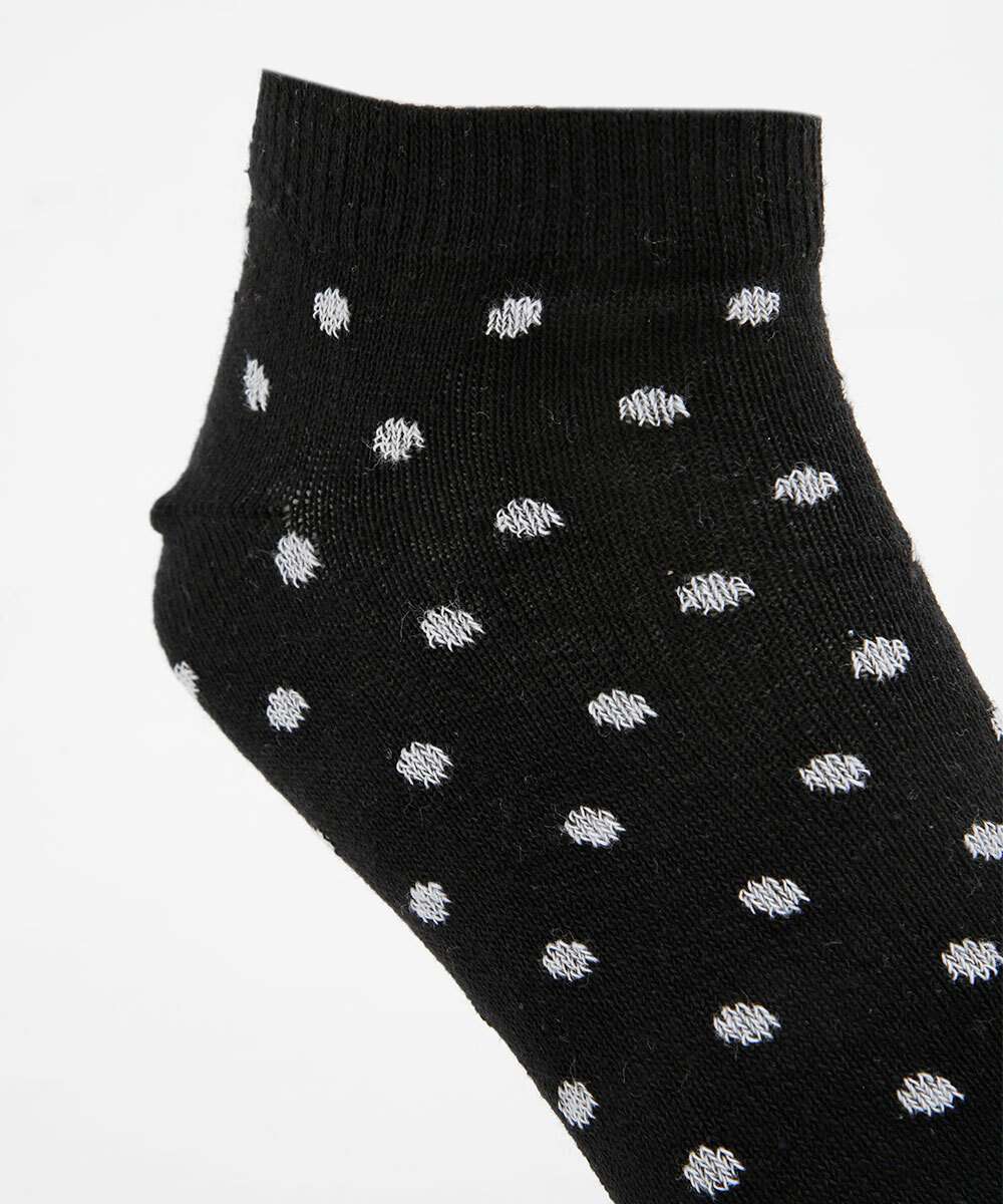 Kit feminino, composto por três pares de meias, modelo cano curto confeccionadas em malha. Possui um par liso, e dois pares com estampa poá, acabamento e ribana e costura no tom.