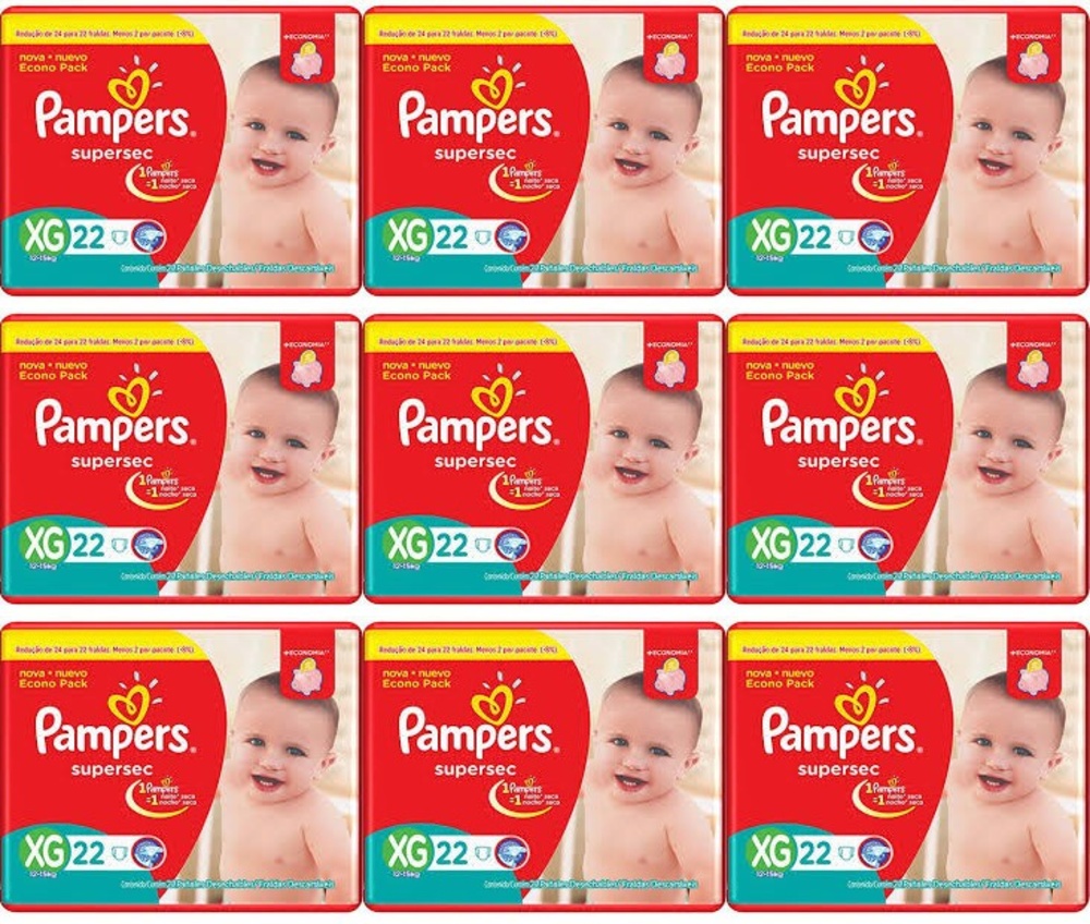 Kit 9 Fraldas Supersec ”Xg” Pampers c/22 Unidades cada. A Fralda Supersec Pacotão “XG” Pampers é a escolha ideal para os papais que buscam conforto e proteção para o seu bebê. Com tecnologia avançada, essas fraldas oferecem máxima segurança e suavidade, garantindo que seu pequeno fique sempre sequinho e confortável. Benefícios:Secagem Rápida: A tecnologia de absorção mantém a pele do bebê seca por mais tempo, prevenindo irritações.Conforto Superior: Com um ajuste perfeito ao corpo do bebê, permitem total liberdade de movimentos.Material Respirável: A camada externa é feita de um material que permite a circulação de ar, mantendo a pele fresca.Indicação:Indicado para bebês que usam a numeração XG, ideal para o uso diário, seja em casa ou em passeios. Modo de Uso:Coloque a fralda de forma que o adesivo fique na parte traseira, ajustando as laterais para que fiquem confortáveis, mas seguras. Verifique frequentemente para garantir que a fralda esteja bem posicionada e troque sempre que necessário. Resultado:Seu bebê ficará confortável e livre de assaduras, pronto para explorar o mundo com segurança! Composição:Fabricada com materiais de alta qualidade que garantem a proteção e o conforto do seu bebê. Precauções:Manter em local fresco e seco. Evitar contato com produtos químicos. Em caso de irritação, suspenda o uso e consulte um médico. Informações Adicionais:Não realizamos testes em animais.Dermatologicamente testado.Experimente a Fralda Supersec Pacotão “XG” Pampers e descubra como é fácil manter seu bebê confortável e protegido durante todo o dia!