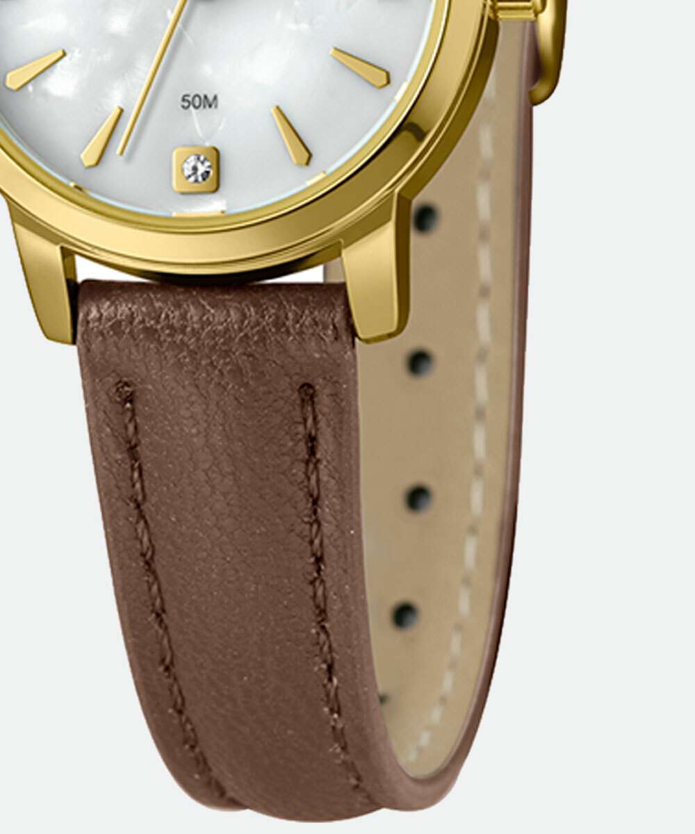 Kit Relógio feminino, com sistema analógico indicando as horas, minutos e segundos. Caixa em metal vidro em cristal mineral e botões para ajuste de horas. Mostrador personalizado com indicadores tracejados e ponteados por strass. Pulseira em couro trabalhado com fechamento por fivela.