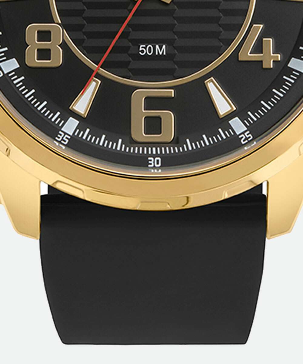 Kit Relógio masculino com sistema analógico com ponteiros indicando as horas, minutos e segundos. Caixa em metal com vidro em cristal mineral e pino para ajuste de horas. Mostrador personalizado com calendário diário, formato 12/24 horas, iluminação noturna, indicadores númericos e tracejados. Pulseira em silicone com fechamento por fivela.