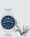 Kit relógio masculino com sistema analógico com ponteiros indicando as horas, minutos e segundos. Caixa em aço com vidro em cristal mineral e pino para ajuste de horas. Mostrador personalizado com calendário diário, indicadores tracejados. Pulseira em aço trabalhado com fechamento por mola.