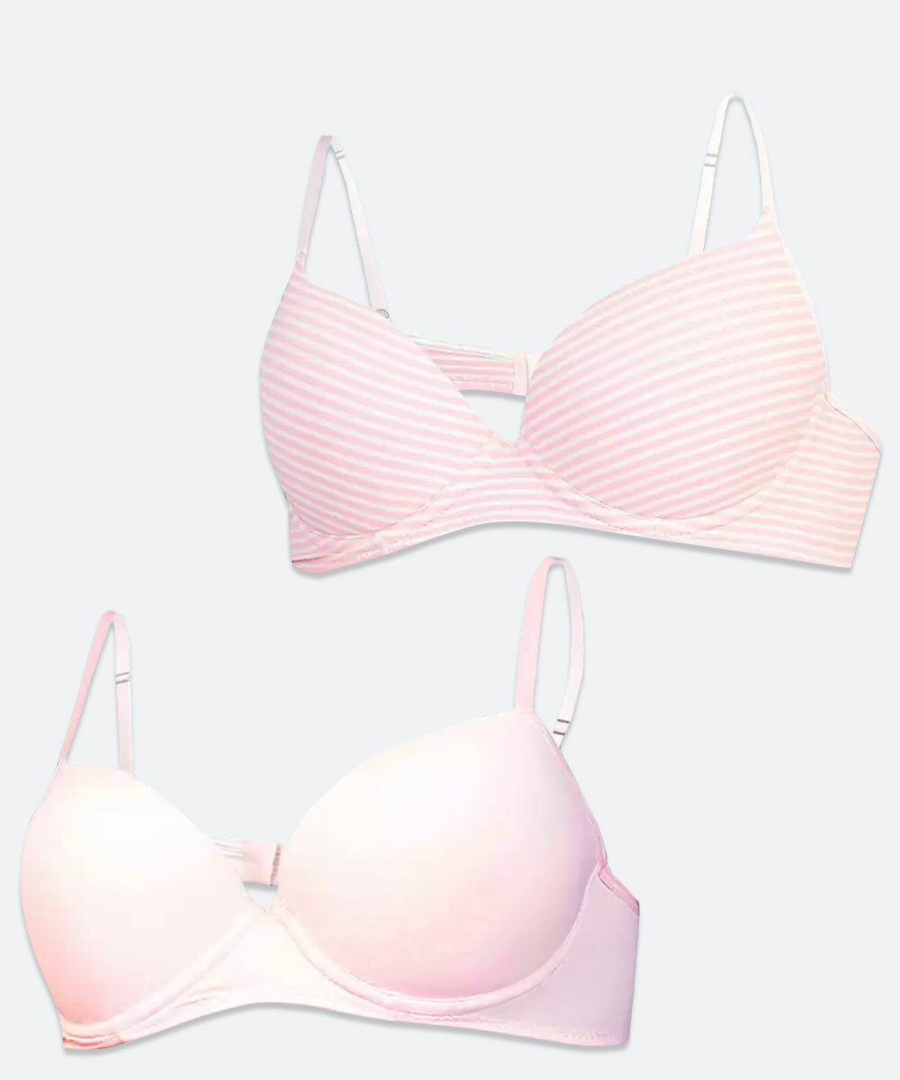 Kit composto por dois sutiãs modelo com base, confeccionados em tecido poliamida e elastano, composto por um sutiã com estampa listrado e outro liso. Possui alças reguláveis, fechamento por colchetes na parte de trás, bojo, forro, acabamento e costura no tom.