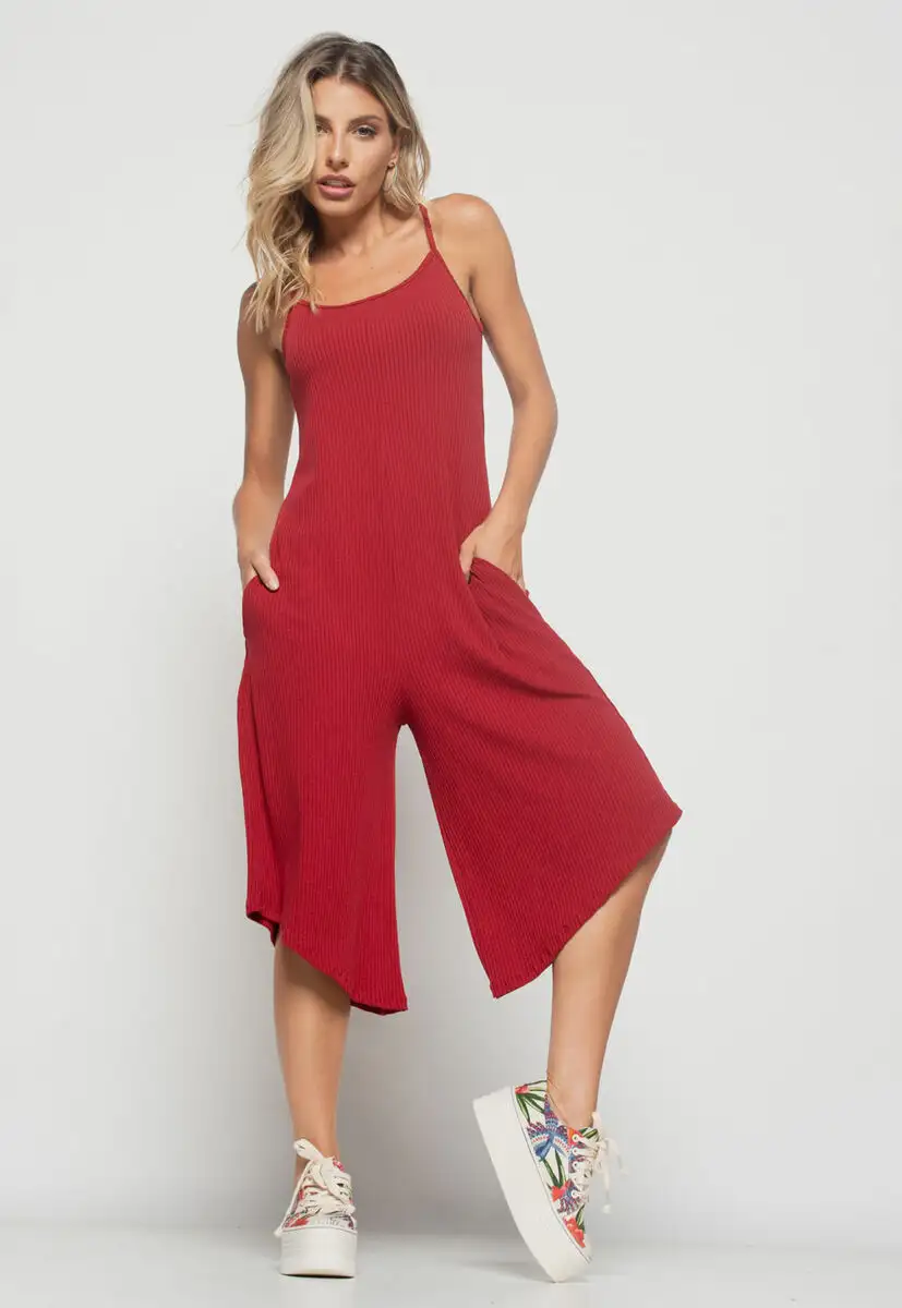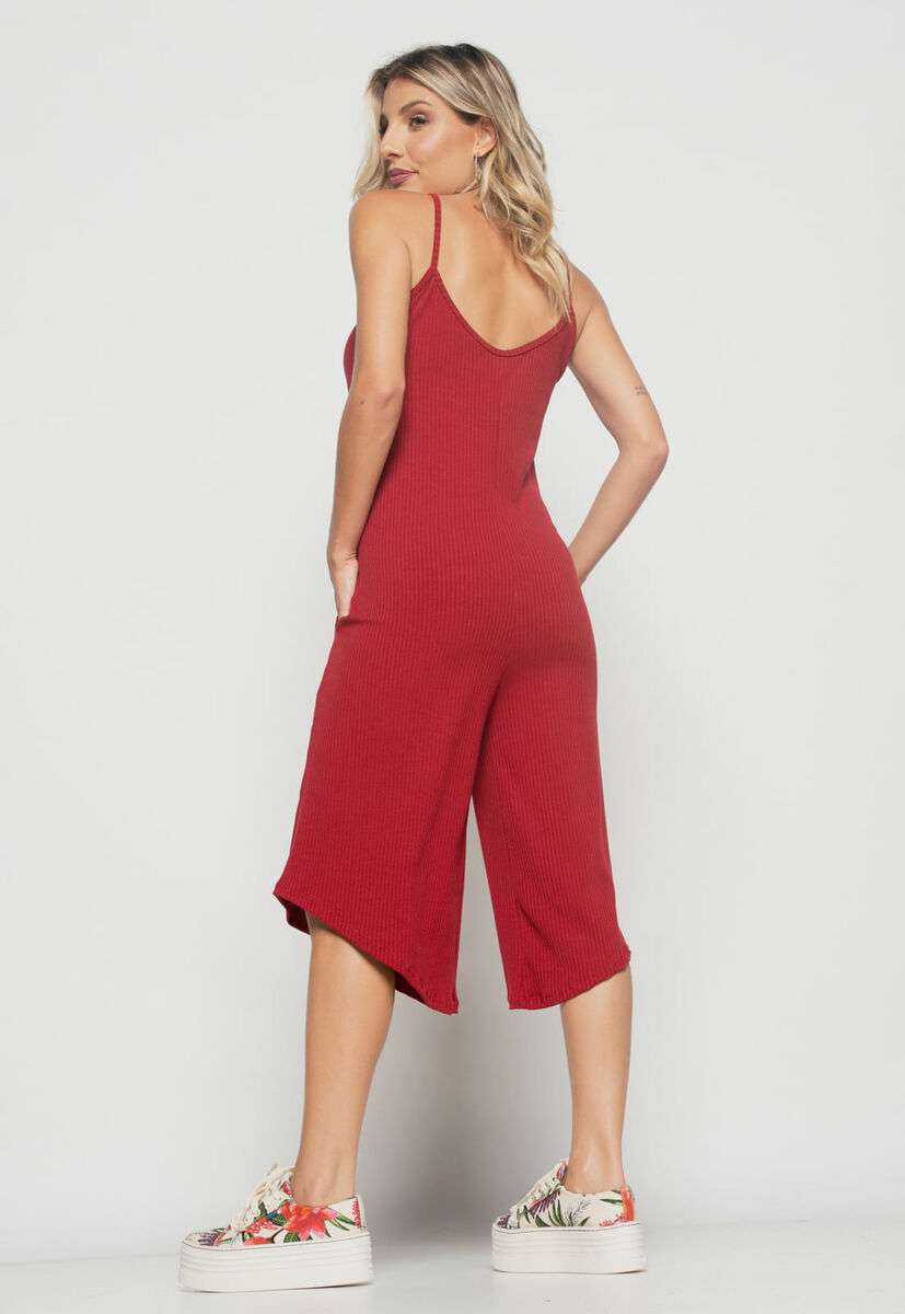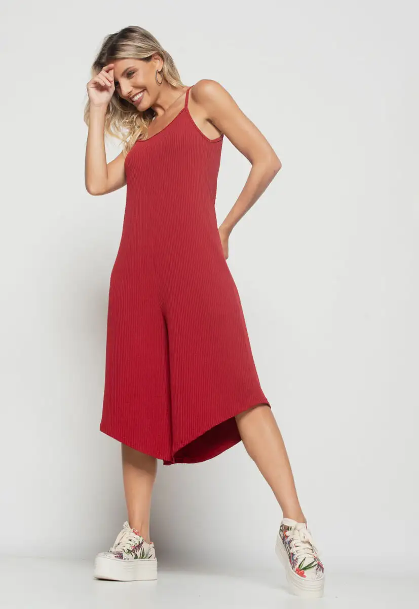 Macacão Alça Fina Pantacourt Canelado Vermelho