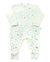Macacão de bebê feito em suedine de algodão com detalhes em estampa de bolinhas e bordado com aplicações e linha metalizada prata. O suedine é uma malha muito macia e confortável e por isso é muito indicado para os bebês, que tem uma pele sensível. Sua golinha é careca pra não tampar o rostinho do bebê. Os pezinhos são reversíveis, ou seja, podem ser usados com ou sem pezinho. A abertura é frontal com botões metálicos com detalhes em glítter e inferior com botões metálicos.