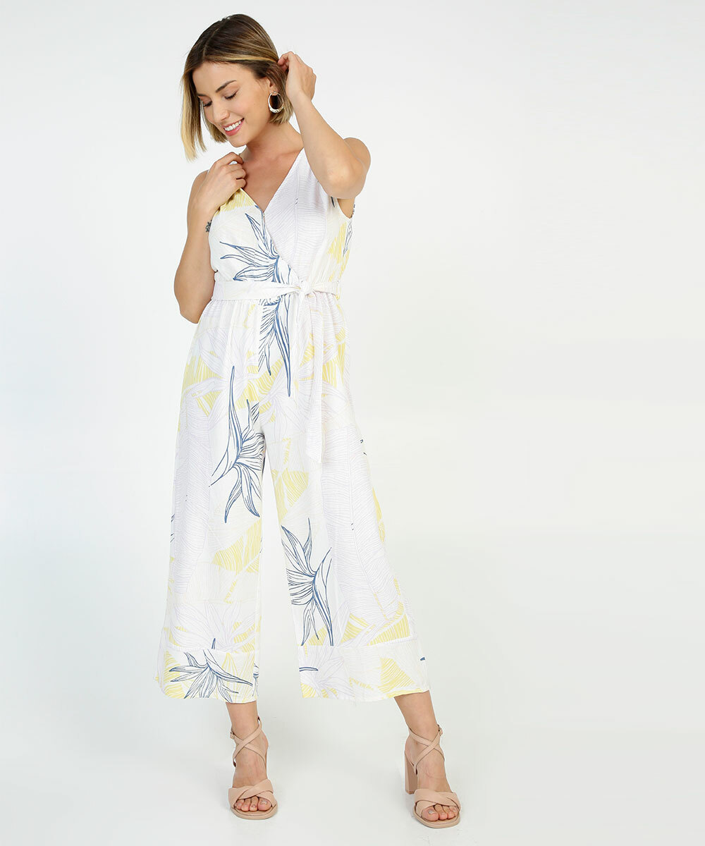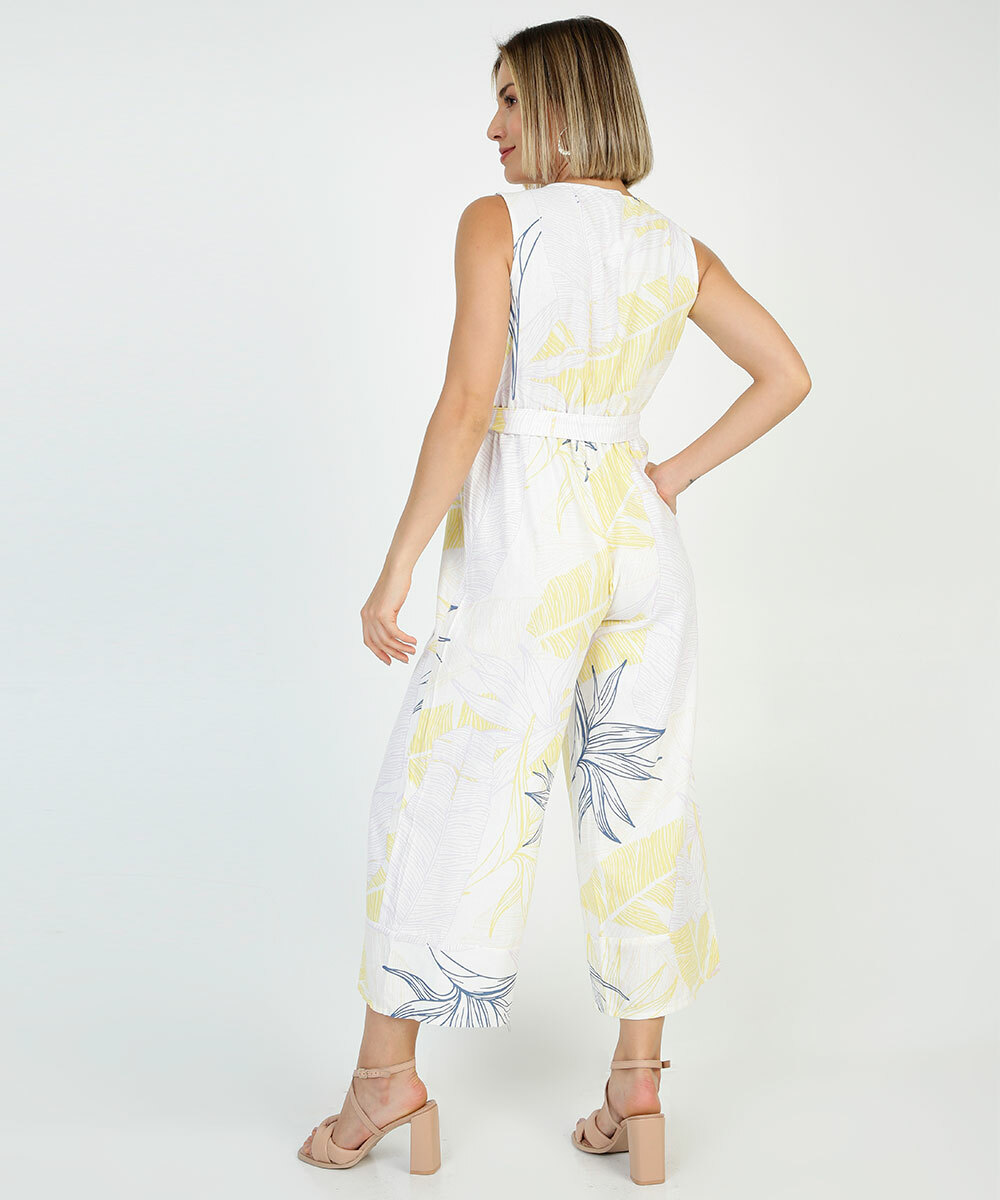 Macacão feminino, modelo pantacourt, confeccionado em tecido plano viscose, linho e algodão. Possui decote v, estampa folhas, amarração, sem manga, acabamento e costura no tom.