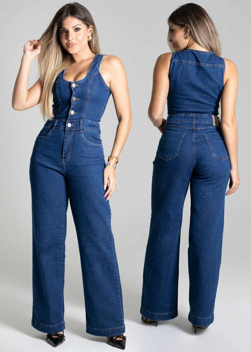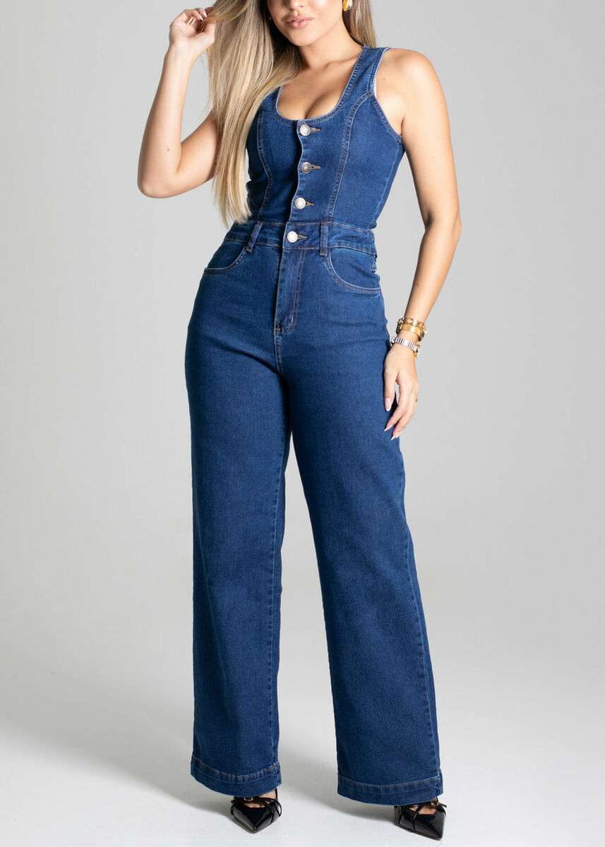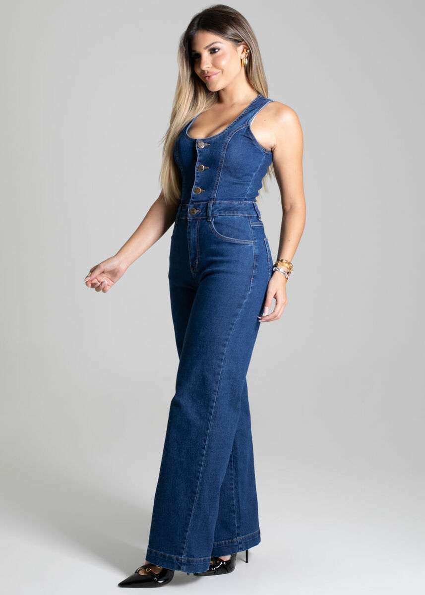 Macacão feminino confeccionado em jeans, proporcionando maior conforto e flexibilidade. O detalhe está na modelagem wide leg com corte diferenciado Fechamento frontral por botões Bolsos frontais e traseiros funcionais Barra simples Tecido: Jeans Tipo de Lavagem: Color Cor: Azul médio