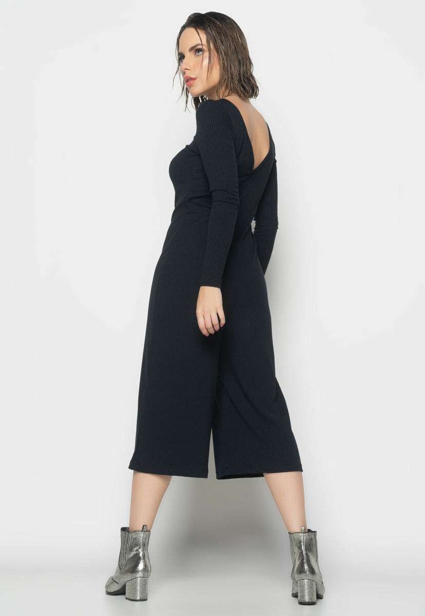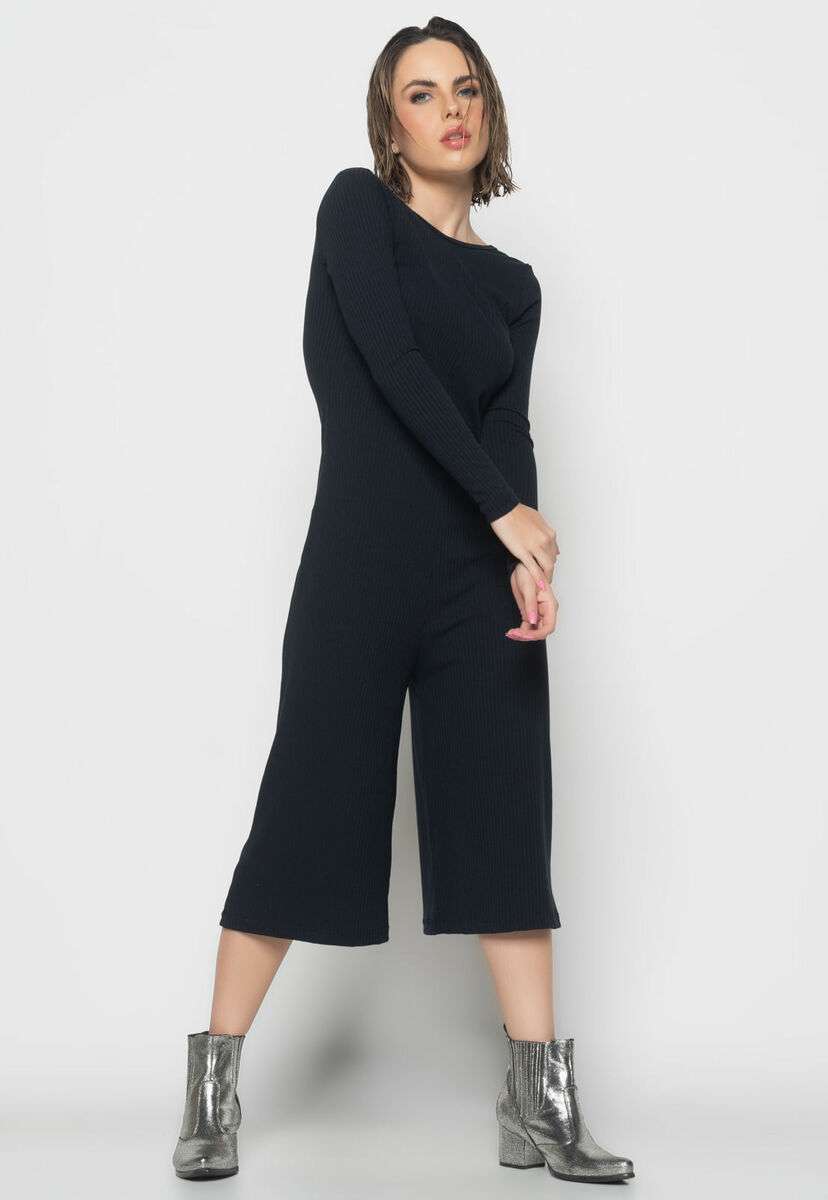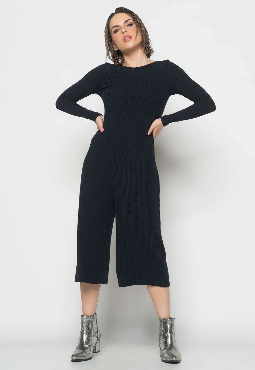 Macacão Manga Longa Pantacourt Canelado Fashion Preto